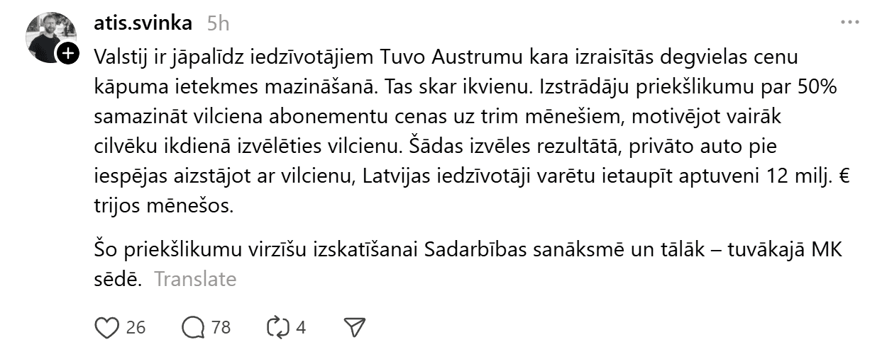 Viņš norāda, ka valstij ir jāpalīdz iedzīvotājiem Tuvo Austrumu kara izraisītā degvielas cenu kāpuma ietekmes mazināšanā, kas patlaban skar ikvienu.