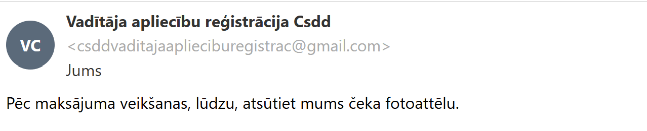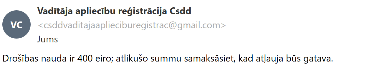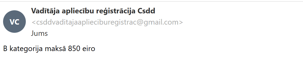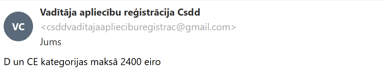 Lai to noskaidrotu, nolēmu sazināties ar šī pakalpojuma piedāvātājiem e-pastā, jo profila aprakstā bija norādīts, ka saziņai jāizmanto tieši šis kanāls. Viņi man skaidroja, ka B kategorijas autovadītāja apliecību iespējams iegādāties par 850 eiro. Savukārt par D un CE kategorijām kopā tika prasīti 2400 eiro.