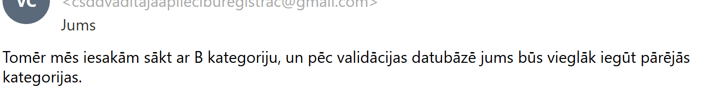 Vienlaikus tika norādīts, ka ieteicams sākt ar B kategoriju, jo pēc tās “reģistrēšanas datubāzē” pārējo kategoriju iegūšana būšot vienkāršāka.