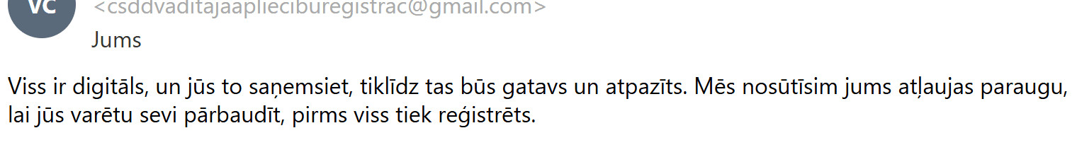 Nākamais solis bija piedāvājums turpināt sarunu ārpus e-pasta, izmantojot saziņas vietni “Whatsapp”, lai varētu uzsākt failu reģistrēšanu CSDD datubāzē. Šim solim gan es nepiekritu.