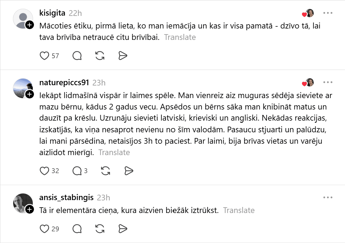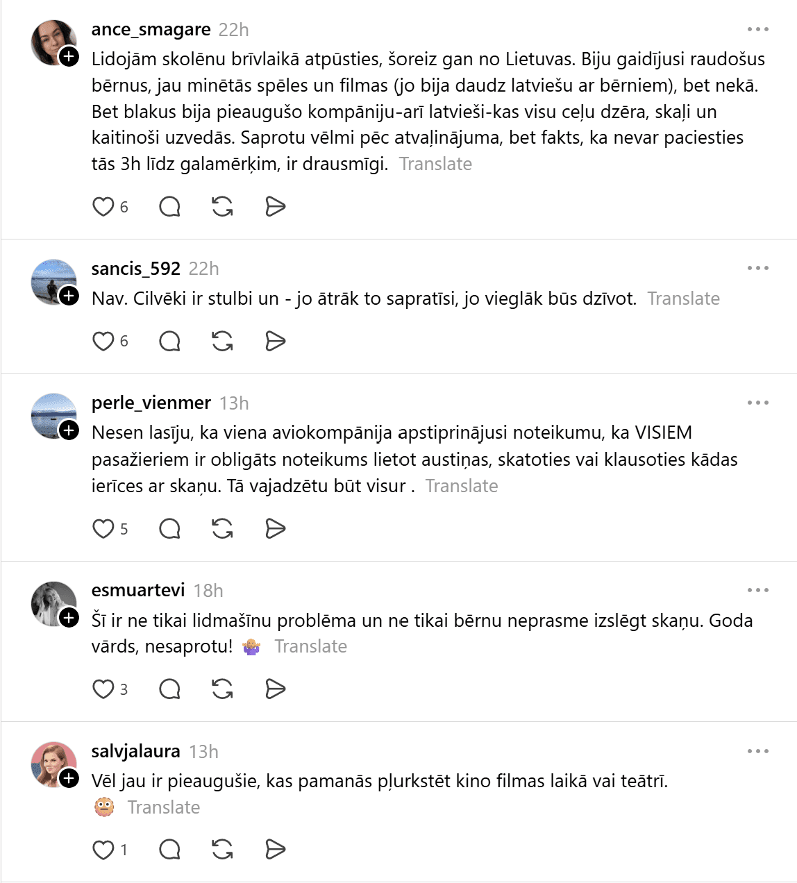 “Klusums un cieņa pret otra telpu – ekskluzivitāte un luksus? Lidoju lidmašīnā, man ir trīs bērni, bet NEVIENS neklausās ipadu vai tutu uz skaļuma režīmu – visiem ir austiņas. Tikmēr visi pārējie bērni lidmašīnā – iet filmas, spēles, kuras tiek spēlētas pa 3 puišiem rindā online programmā ar skaņas efektiem. Tikmēr vecāki vai nu guļ, vai pašiem ir austiņas. Mēs kopā dalām vienu telpu – vai tā nav elementāra cieņa un lidmašīnas uzvedības nerakstītais kods par telpu, ko dalām mesa visi?”
