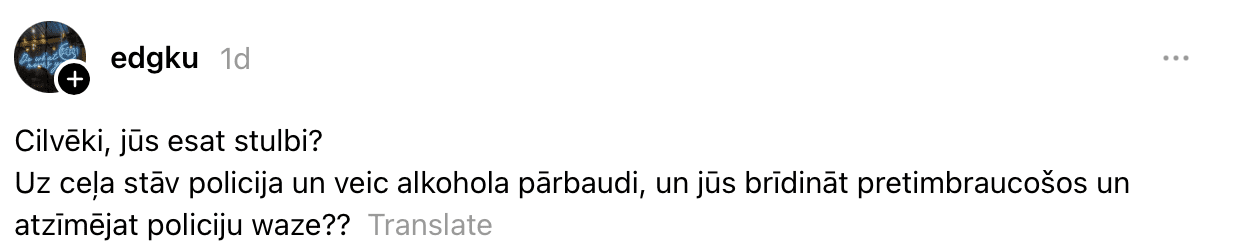“Ja nemaldos, bija valstis, kurās Waze ir ierobežotas funkcijas, tai skaitā paziņot par policijas esamību kādā posmā. LV to vajadzētu.”