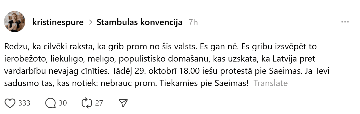 “Redzu, ka cilvēki raksta, ka grib prom no šīs valsts. Es gan nē. Es gribu izsvēpēt to ierobežoto, liekulīgo, melīgo, populistisko domāšanu, kas uzskata, ka Latvijā pret vardarbību nevajag cīnīties. Tādēļ 29. oktobrī 18.00 iešu protestā pie Saeimas. Ja Tevi sadusmo tas, kas notiek: nebrauc prom. Tiekamies pie Saeimas,” aicina Spure.