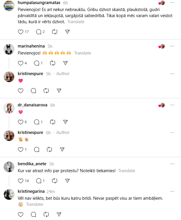 Tekstu autore, tulkotāja un TV un radio personība Kristīne Spure sociālajā tīklā “Threads” aicina cilvēkus nevis nodot Latviju, rakstot, ka pēc šāda deputātu gājiena rodas vēlme pamest savu valsti, bet gan doties protestā un cīnīties.