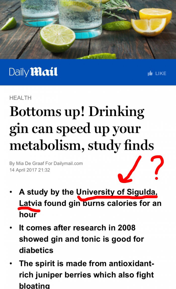 Britu medijs “The Daily Mail”, stāstot par džina labvēlīgo ietekmi uz vielmaiņu, atsaucies uz pētījumu, kas it kā veikts Latvijā – Siguldas universitātē. Tajā esot piedalījušies pazīstami pētnieki, piemēram, profesore Tisa Lī.