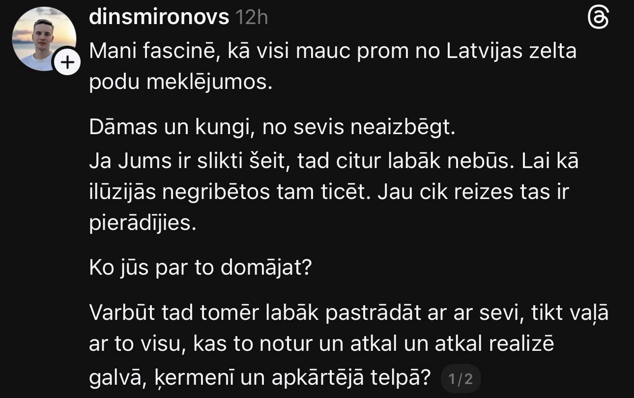 Dins vietnē “Threads” izteicis interesantu viedokli – emigrējot, problēmas nepaliek Latvijā, bet tās “nāk līdzi”, lai arī kur cilvēks dotos.