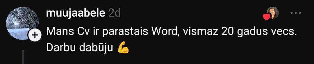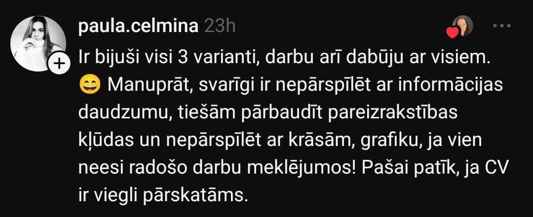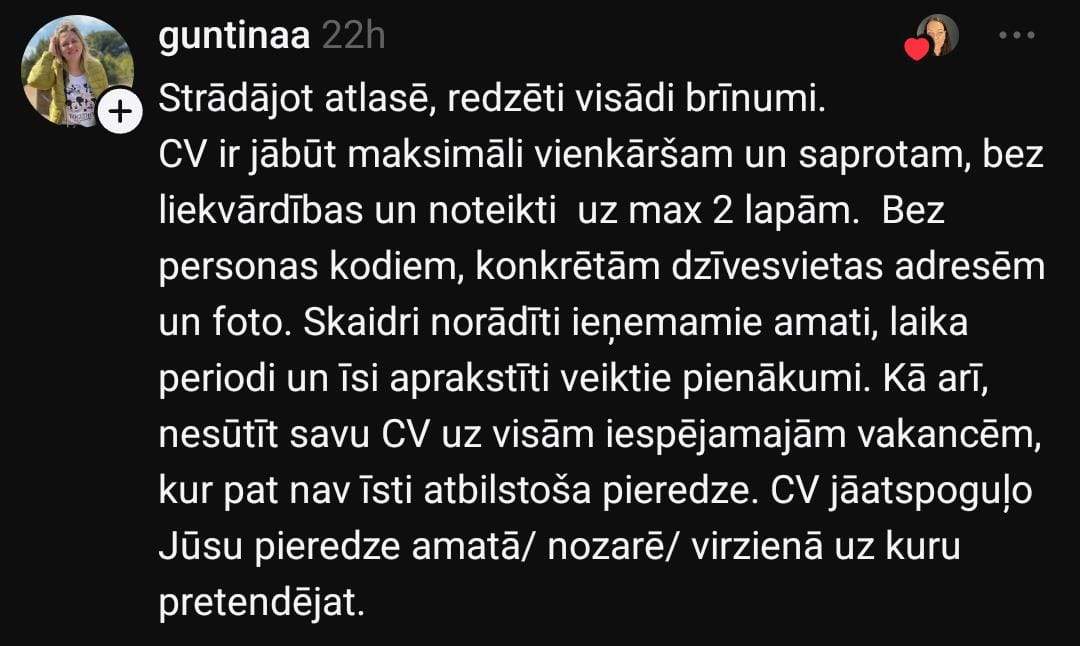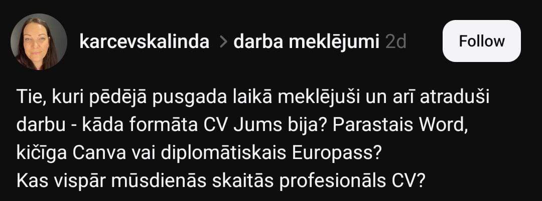 “Tie, kuri pēdējā pusgada laikā ir meklējuši un arī atraduši darbu – kāda formāta CV jums bija? Parastais Word, kičīga Canva vai diplomātiskais Europass? Kas mūsdienās vispār skaitās profesionāls CV?”
