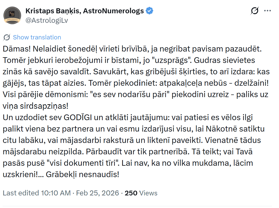 “Dāmas, nelaidiet šonedēļ vīrieti brīvībā!” Astrologs Baņķis brīdina daiļā dzimuma pārstāves 0