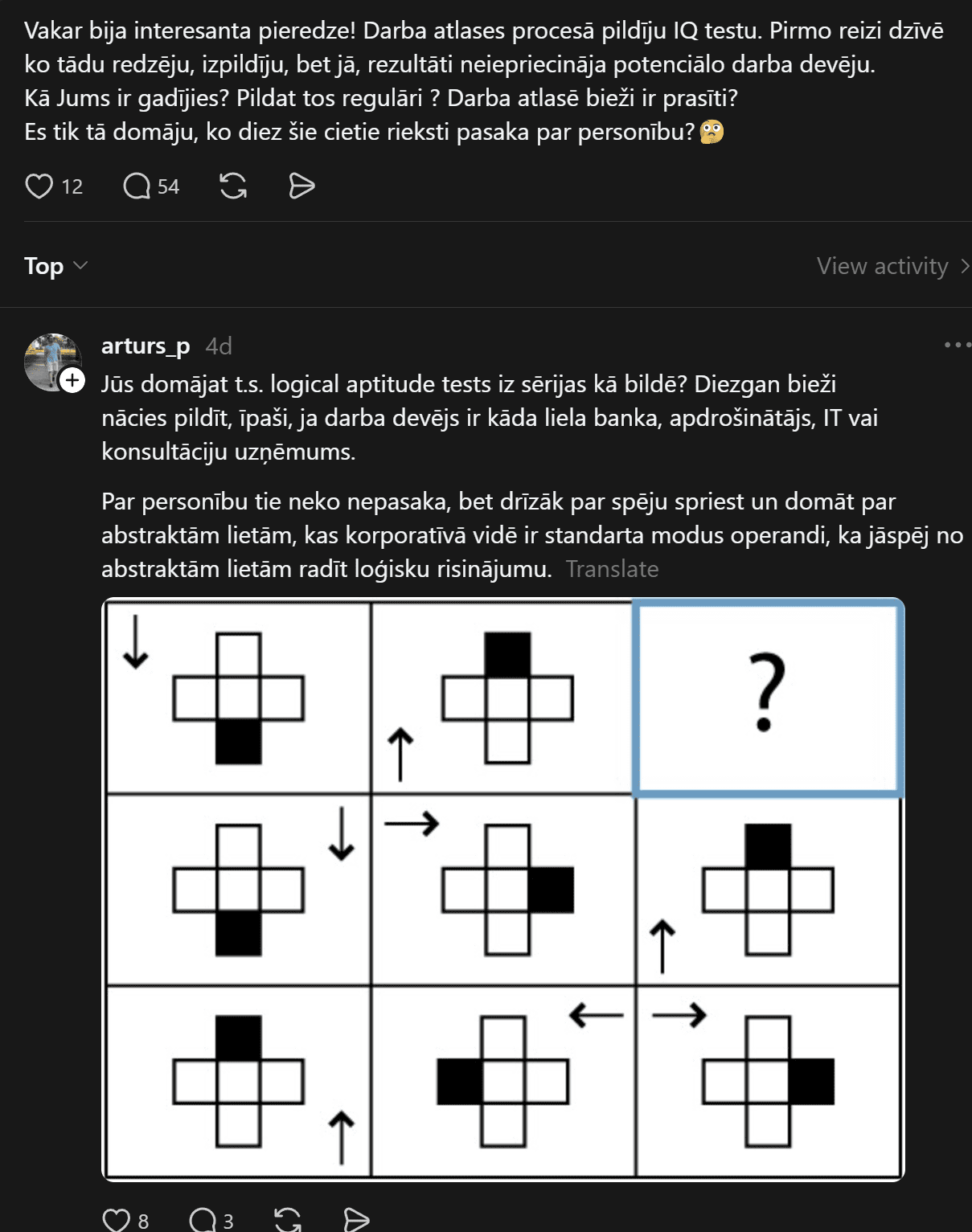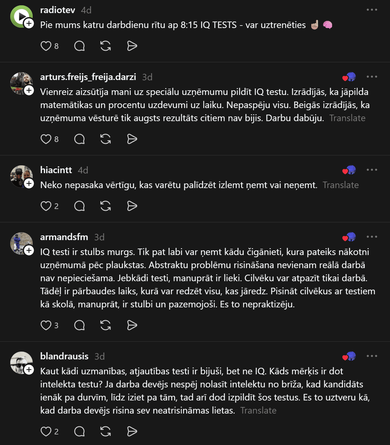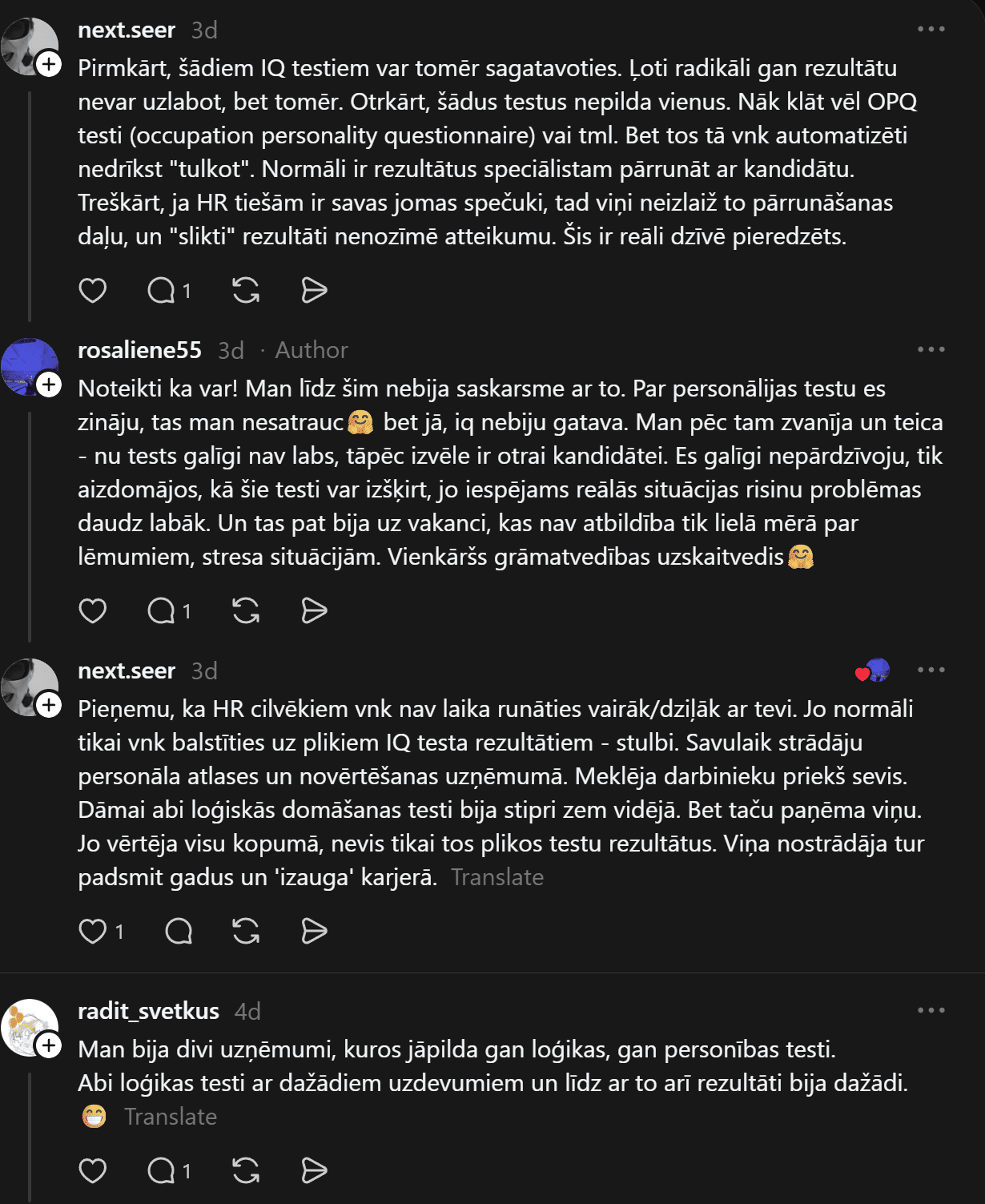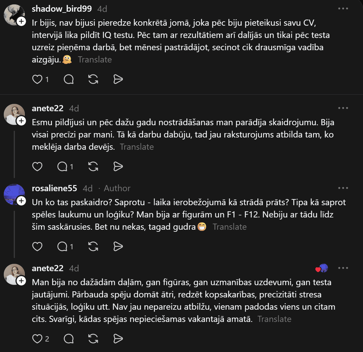 “Vakar bija interesanta pieredze! Darba atlases procesā pildīju IQ testu. Pirmo reizi dzīvē ko tādu redzēju, izpildīju, bet jā, rezultāti neiepriecināja potenciālo darba devēju. Kā Jums ir gadījies? Pildāt tos regulāri? Darba atlasē bieži ir prasīti? Es tik tā domāju, ko diez šie cietie rieksti pasaka par personību?” sieviete jautā.