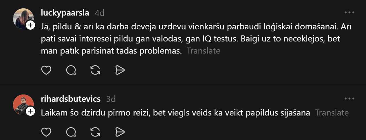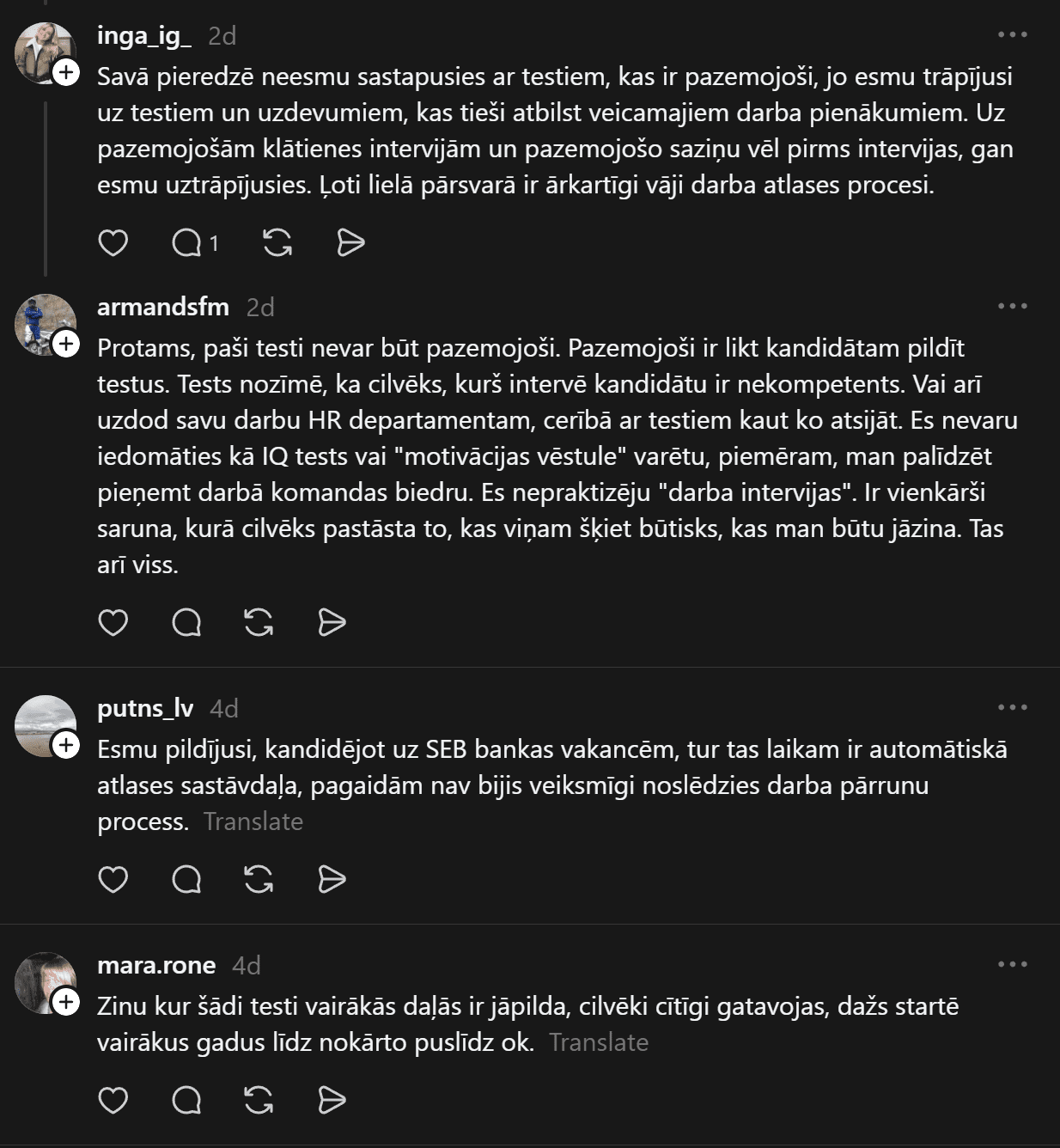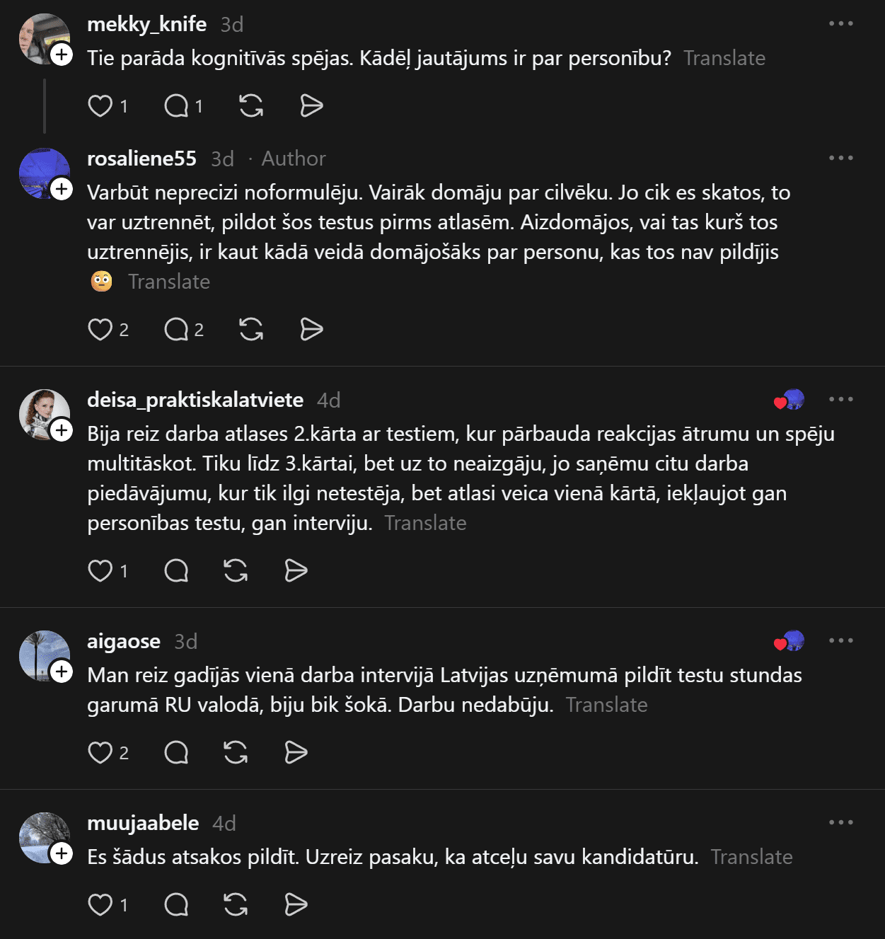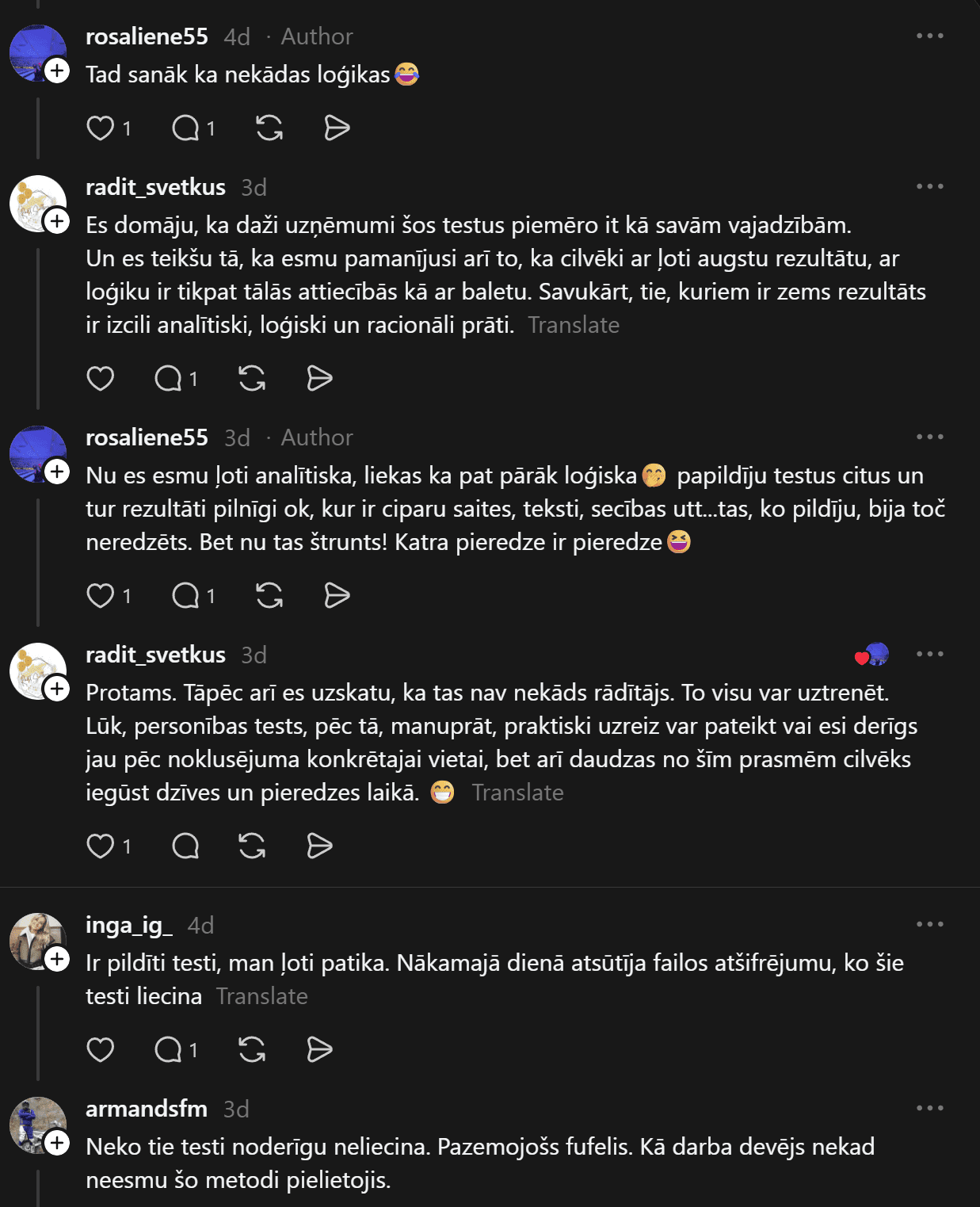 “Vakar bija interesanta pieredze! Darba atlases procesā pildīju IQ testu. Pirmo reizi dzīvē ko tādu redzēju, izpildīju, bet jā, rezultāti neiepriecināja potenciālo darba devēju. Kā Jums ir gadījies? Pildāt tos regulāri? Darba atlasē bieži ir prasīti? Es tik tā domāju, ko diez šie cietie rieksti pasaka par personību?” sieviete jautā.