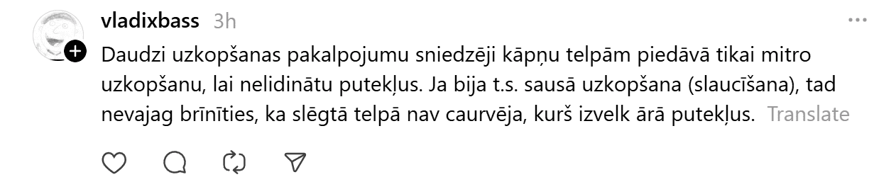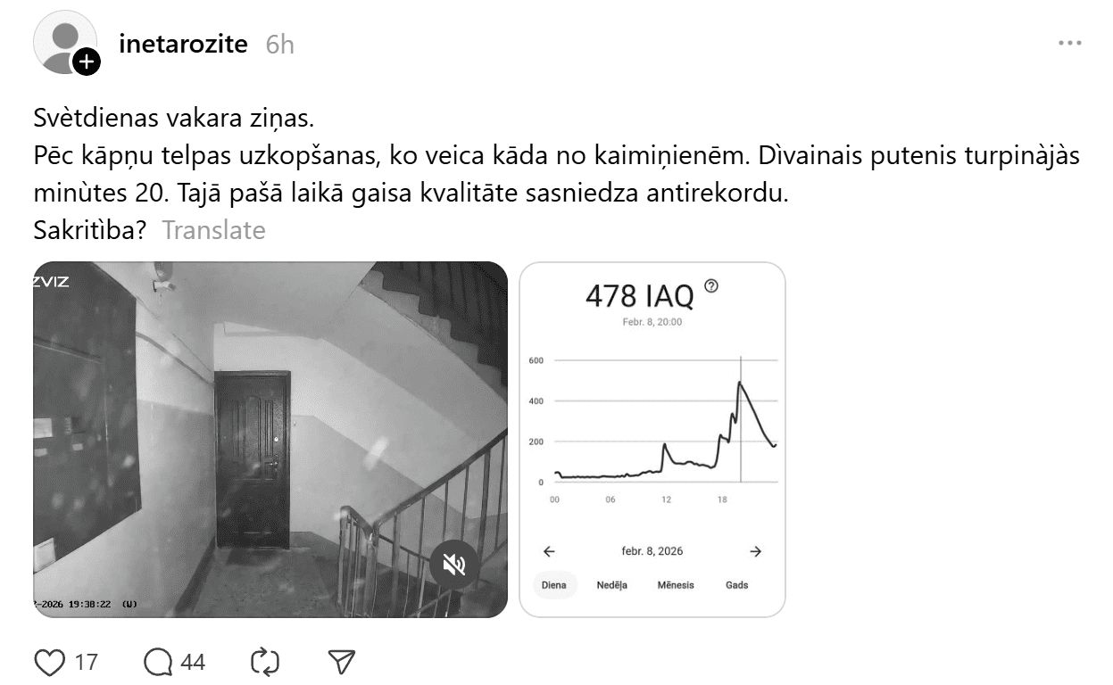 “Pēc kāpņu telpas uzkopšanas, ko veica kāda no kaimiņienēm. Dīvainais putenis turpinājās minūtes 20. Tajā pašā laikā gaisa kvalitāte sasniedza antirekordu. Sakritība?” rakstīja “Threads” lietotāja.