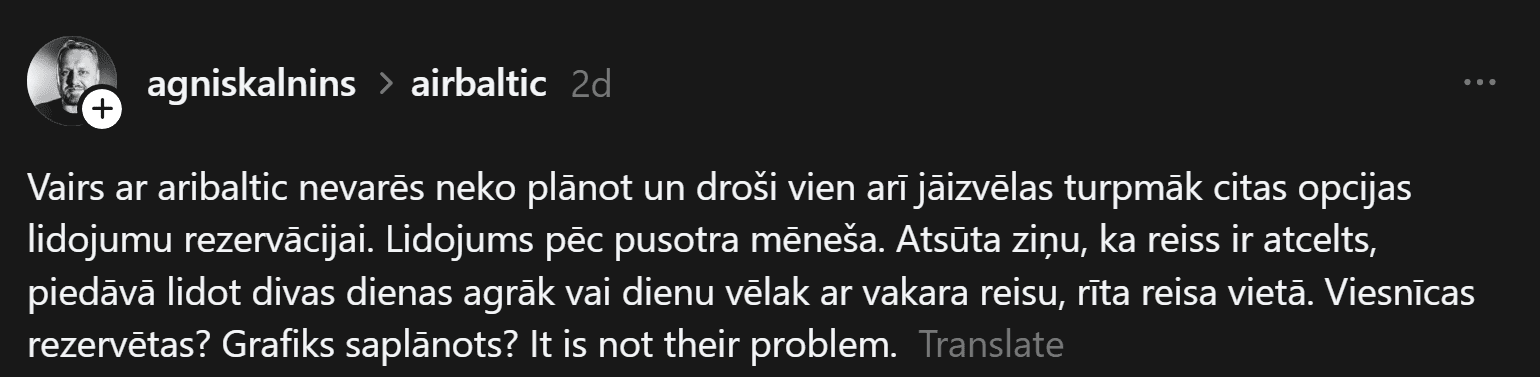 “Vairs ar airBaltic nevarēs neko plānot, un droši vien arī jāizvēlas turpmāk citas opcijas lidojumu rezervācijai. Lidojums pēc pusotra mēneša. Atsūta ziņu, ka reiss ir atcelts, piedāvā lidot divas dienas agrāk vai dienu vēlāk ar vakara reisu rīta reisa vietā. Viesnīcas rezervētas? Grafiks saplānots? Tā nav viņu problēma,” socvietnē “Threads” raksta Agnis. Daļa komentētāju gan vērš uzmanību, ka “airBaltic” nebūt nav vienīgā aviokompānija, kas atceļ reisus. Tāpat tiek norādīts, ka šādi notiek arī tad, kad nav degvielas cenu krīzes.