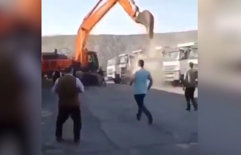 Aculiecinieka uzņemtajā video Turcijā, Širnakas provincē, redzams, kā ogļu raktuves strādnieks ar ekskavatora kausu sadragā vairāku kravas automašīnu jumtus.