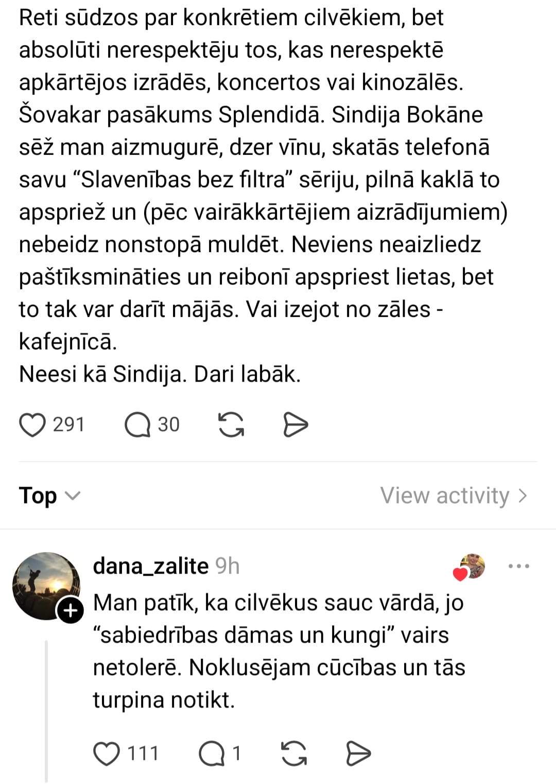 Dodoties baudīt mākslu, gan teātrī, gan koncertos ir nerakstīti (un patiesībā pat bieži vien skaidri un gaiši uzrakstīti) likumi, kas jāievēro pasākuma apmeklētājiem publiskā vietā. Visiem ievērojot šos noteikumus, ikviens klātesošais var baudīt priekšnesumus un viens otram netraucēt, tomēr, ja kāds “izkrīt no ierindas”, pastāv liela iespējamība, ka par to tiks uzrakstīts arī soctīklos, īpaši, ja esi sabiedrībā atpazīstams cilvēks. Šoreiz kāda pasākuma apmeklētāja publiski sūdzas par Sindijas Bokānes uzvedību, kura koncerta laikā trokšņojusi, skatījusies pati savu raidījumu “Slavenības. Bez filtra”, skaļi to apspriežot un tādējādi traucējot apkārtējiem.