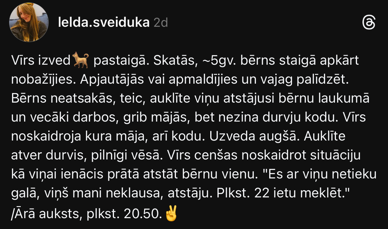 Bērnam patiešām bija vajadzīga palīdzība: “Bērns neatsakās, teic, auklīte viņu atstājusi bērnu laukumā, un vecāki darbos, grib mājās, bet nezina durvju kodu. Vīrs noskaidroja, kura māja, arī kodu. Uzveda augšā. Auklīte atver durvis, pilnīgi vēsā. Vīrs cenšas noskaidrot situāciju, kā viņai ienācis prātā atstāt bērnu vienu.