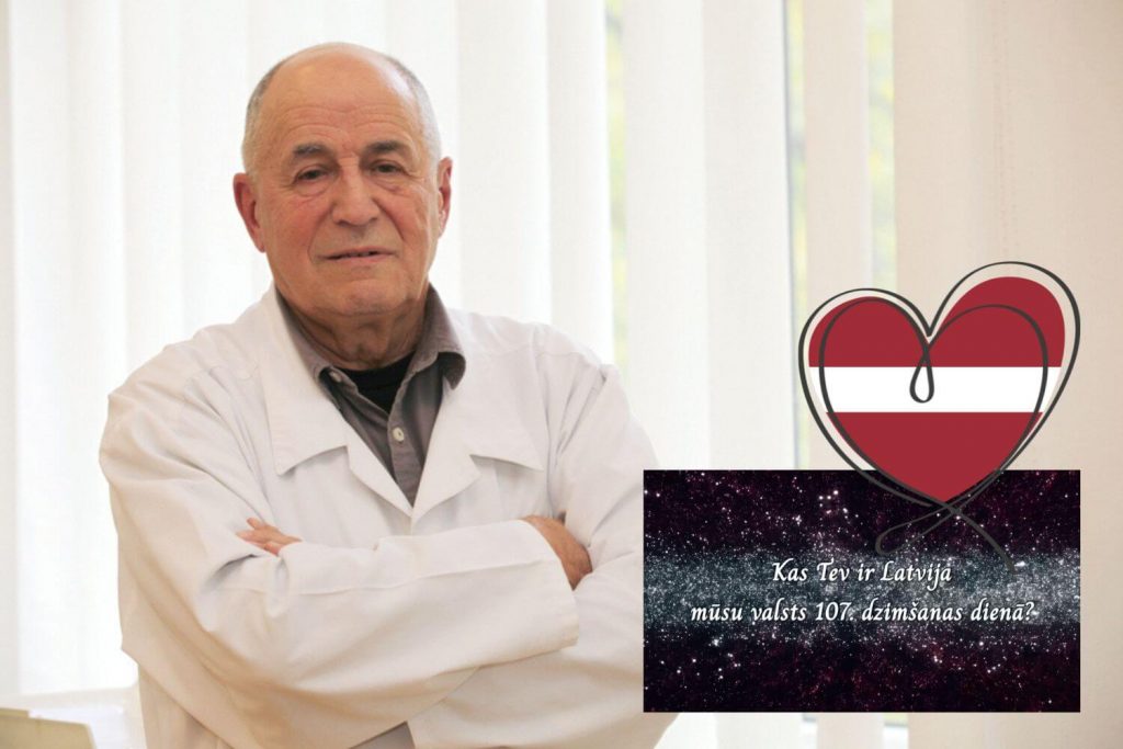 Ko man nozīmē Latvija šodien? Es domāju, ka esam diezgan grūtā situācija. Tas, kas notiek apkārt. Priekš manis briesmīgi bija tas, ka sākās karš Ukrainā. Tā es esmu palicis ar manu dzimteni, visi mani draugi jau miruši. Mēs ar kundzi paliekuši vieni. Jā, bet viņai tikpat daudz gadu kā man. Jā – tā īsti nav – pie mums ciemos nāk daktere Gita Ņemcova. Tā ir mūsu draudzene. Kā veci cilvēki mēs dzīvojam. Jā, protams, televizors strādā. Uz basketbolu es biju. Mana vieta darbā bija Latvijā. Un, ja es biju Maskavā kongresā, es biju zinātnieks, kas pārstāv