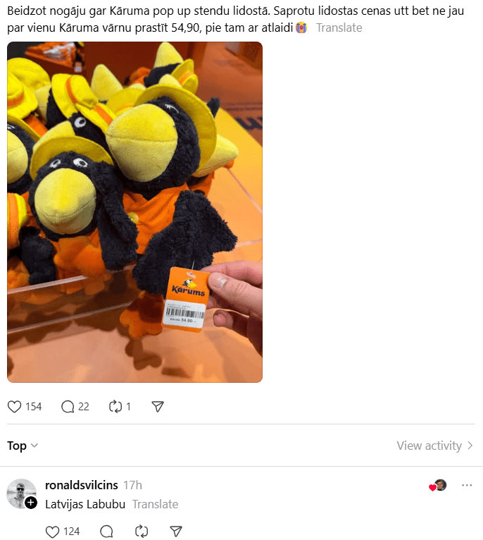 “Beidzot nogāju gar Kāruma pop up stendu lidostā. Saprotu lidostas cenas, bet ne jau par vienu “Kāruma” vārnu prasīt 54,90, pie tam ar atlaidi!” vīrietis sašutis.