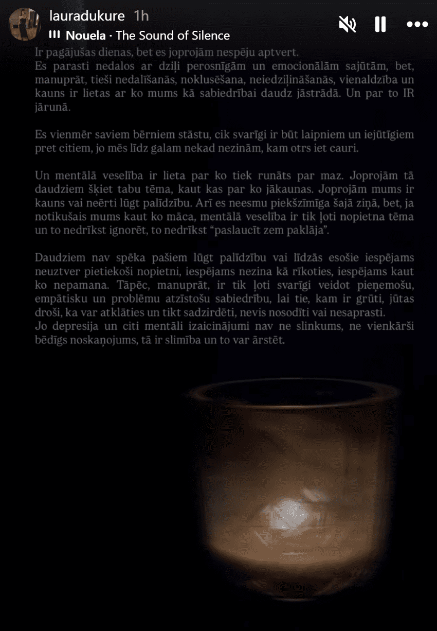 Un mentālā veselība ir lieta par ko tiek runāts par maz. Joprojām tā daudziem šķiet tabu tēma, kaut kas par ko jākaunas. Joprojām mums ir kauns vai neērti lūgt palīdzību. Arī es neesmu priekšzīmīga šajā ziņā, bet, ja notikušais mums kaut ko māca, mentālā veselība ir tik ļoti nopietna tēma un to nedrīkst ignorēt, to nedrīkst “paslaucīt zem paklāja”.