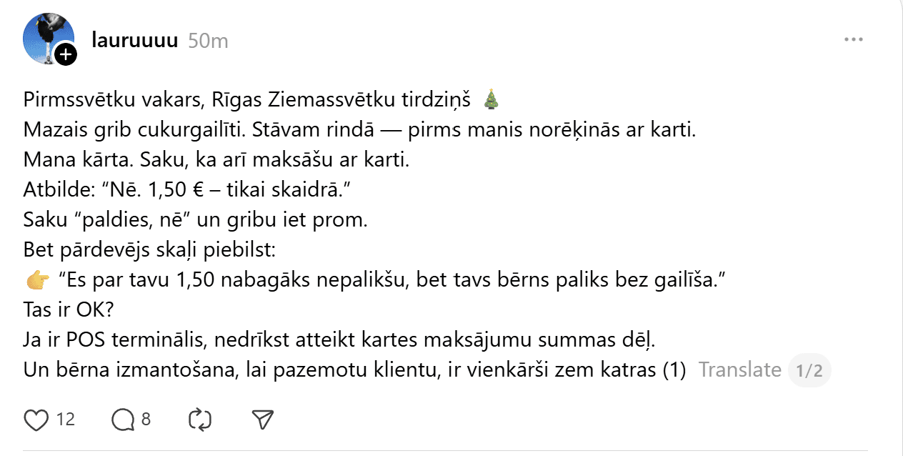 “Mazais grib cukurgailīti. Stāvam rindā – pirms manis norēķinās ar karti. Mana kārta. Saku, ka arī maksāšu ar karti. Atbilde: “Nē. 1,50 € – tikai skaidrā.” Saku “paldies, nē” un gribu iet prom,” viņa raksta.