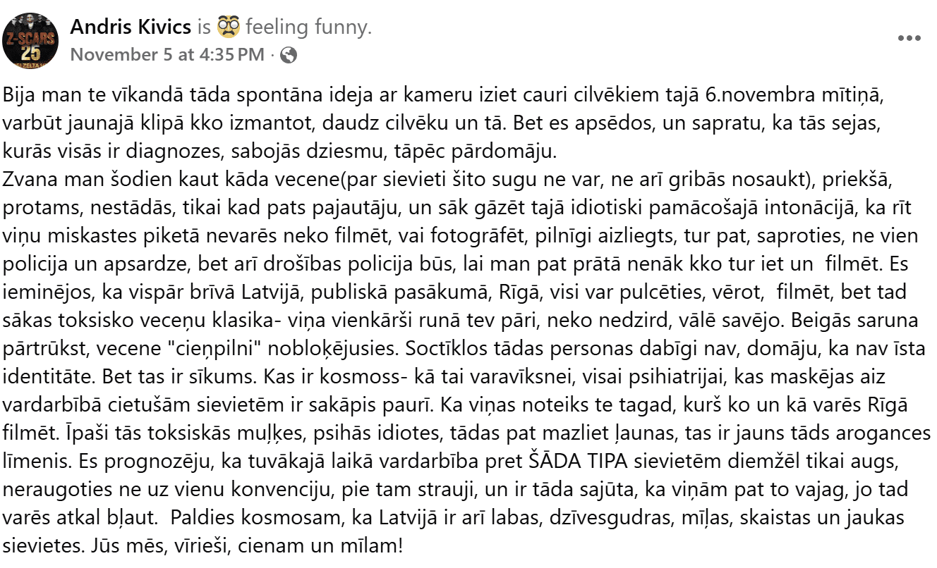 Zvana man šodien kaut kāda vecene (par sievieti šito sugu ne var, ne arī gribās nosaukt), priekšā, protams, nestādās, tikai kad pats pajautāju, un sāk gāzēt tajā idiotiski pamācošajā intonācijā, ka rīt viņu miskastes piketā nevarēs neko filmēt, vai fotogrāfēt, pilnīgi aizliegts, tur pat, saproties, ne vien policija un apsardze, bet arī drošības policija būs, lai man pat prātā nenāk kaut ko tur iet un filmēt. Es ieminējos, ka vispār brīvā Latvijā, publiskā pasākumā, Rīgā, visi var pulcēties, vērot, filmēt, bet tad sākas toksisko veceņu klasika – viņa vienkārši runā tev pāri, neko nedzird, vālē savējo. Beigās saruna pārtrūkst, vecene “cieņpilni” nobloķējusies. Soctīklos tādas personas dabīgi nav, domāju, ka nav īsta identitāte. Bet tas ir sīkums.