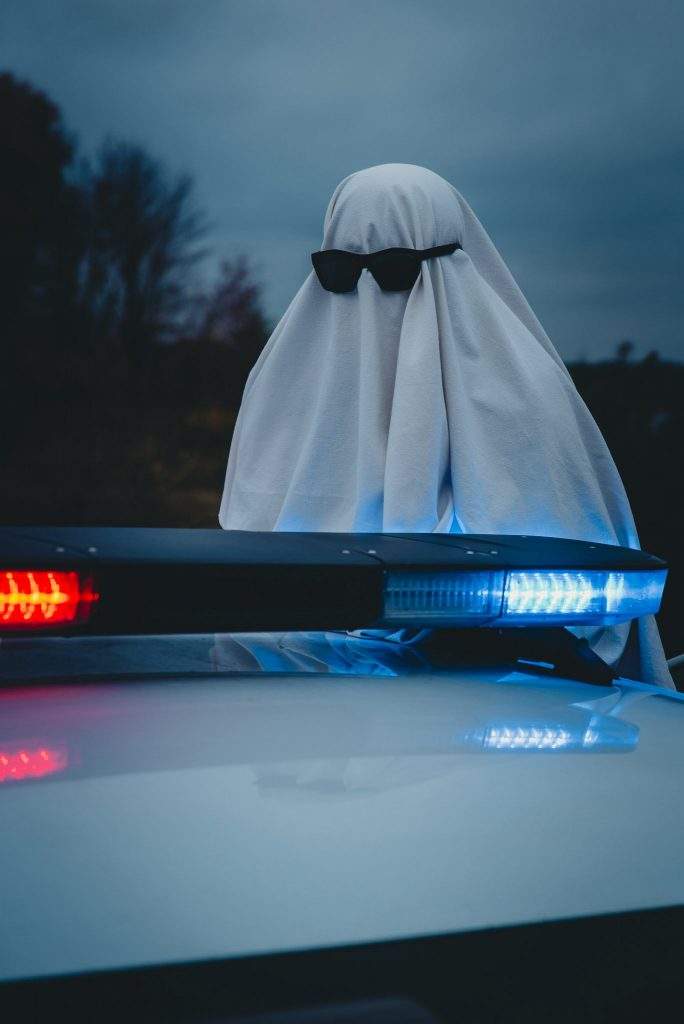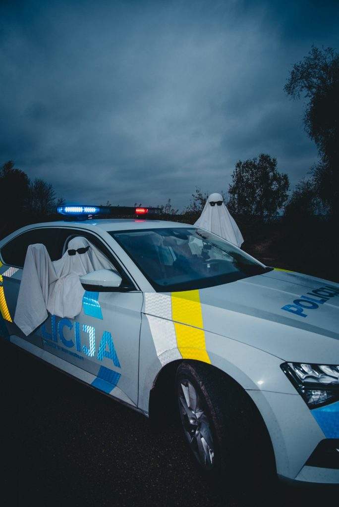Publicētajos attēlos redzami policisti, kuri pārtapuši par spokiem, un viņu tēlus papildina saulesbrilles.
