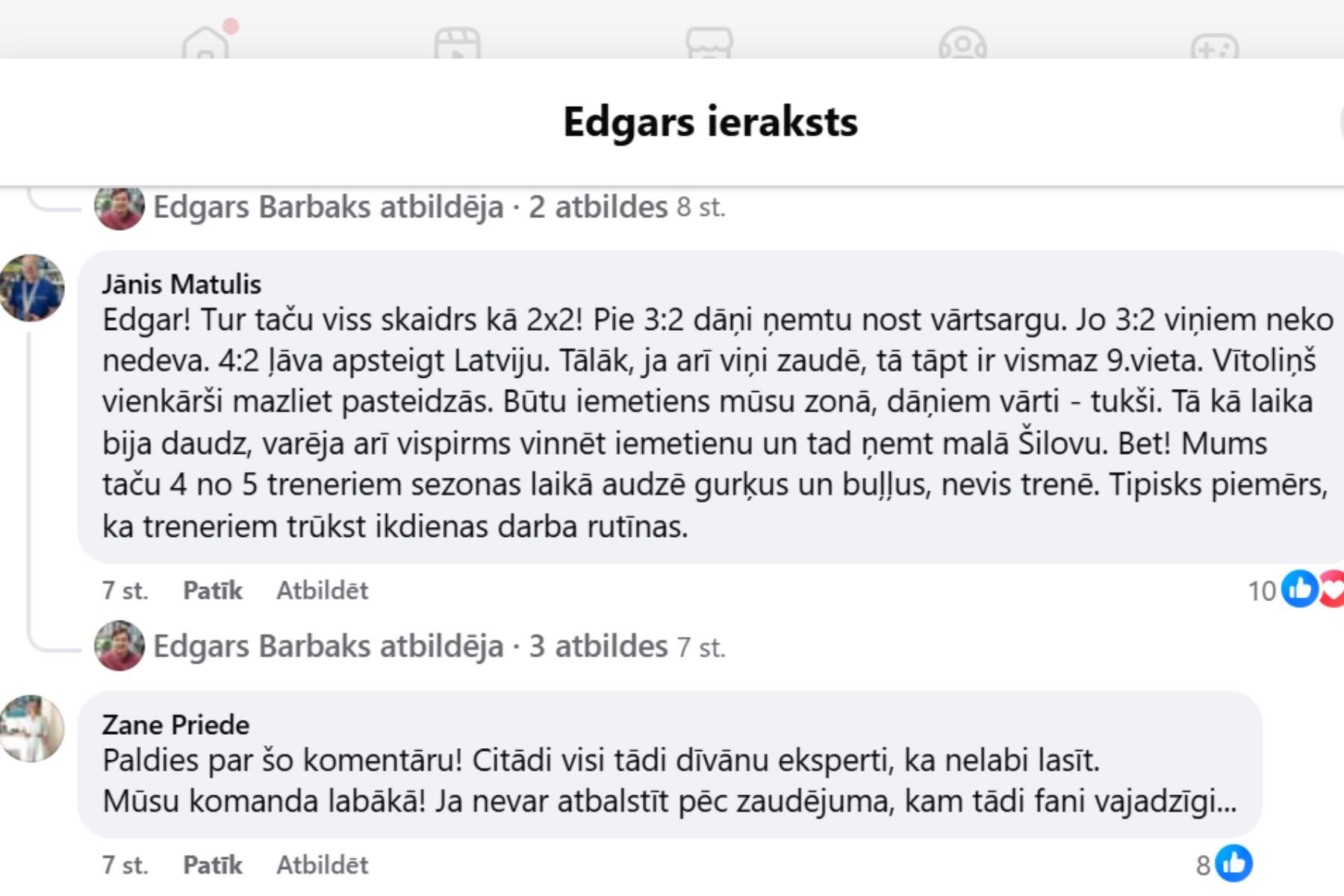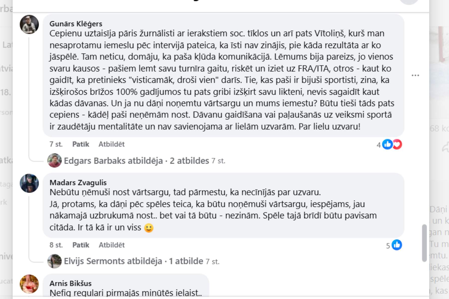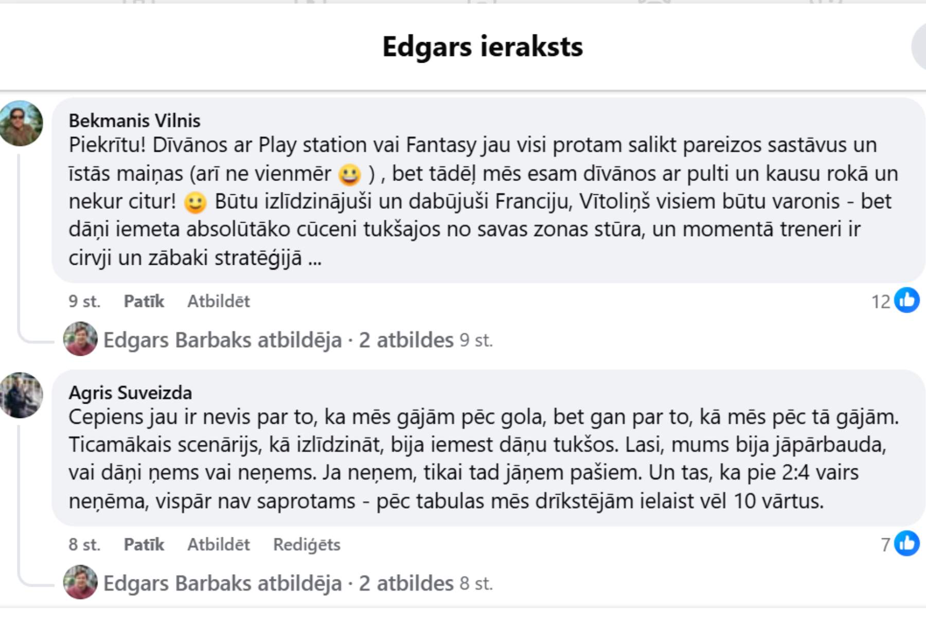 Bildē: Vātsargs, kurš es ceru arī tiks pie spēles šajā turnīrā.” Tā savu sakāmo beidz Edgars Barbaks. Zem šī ieraksta ir daudz un gari nozares entuziastu komentāri, kā tad mūsējiem pēdējā spēlē patiesi veicās.