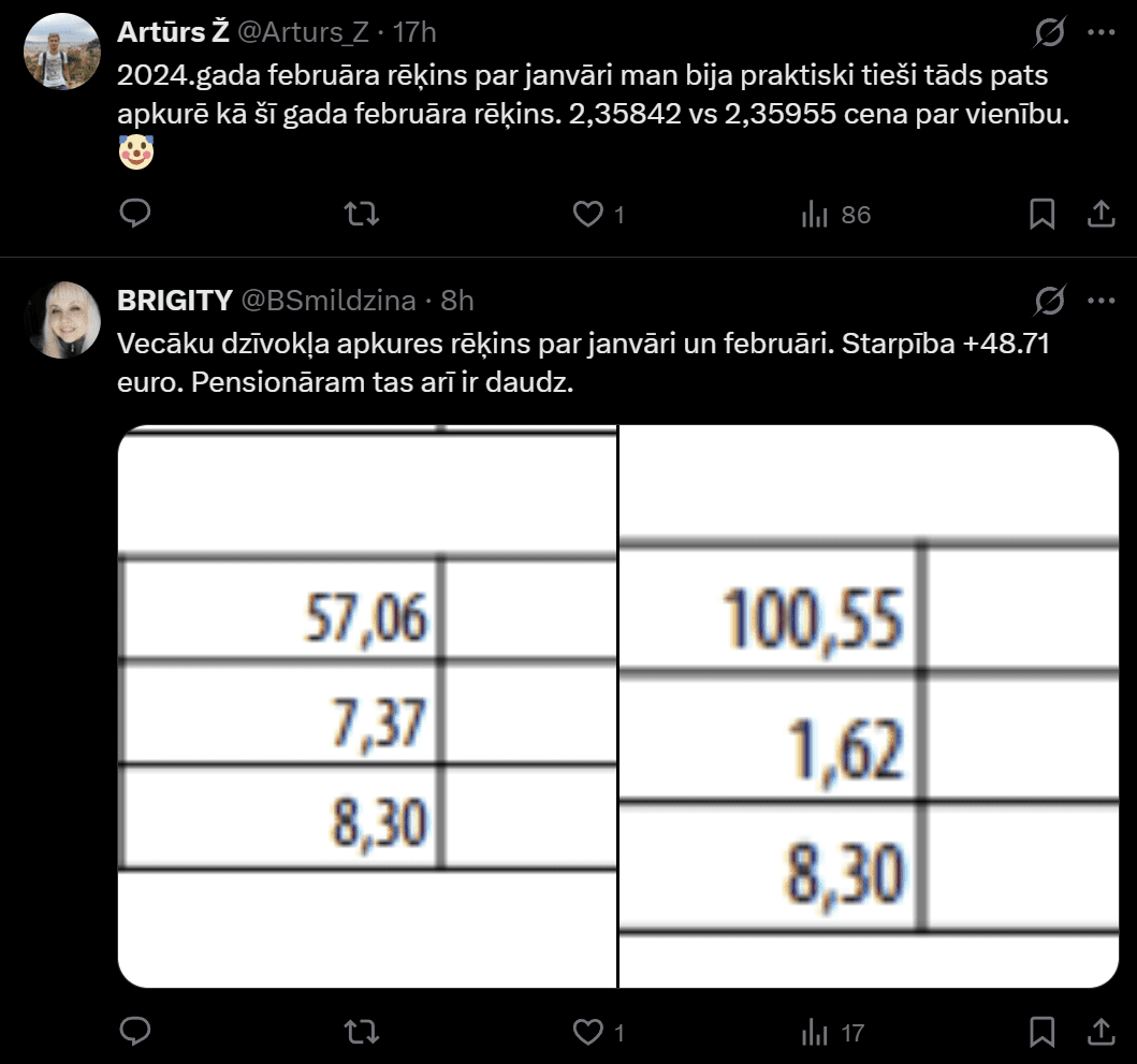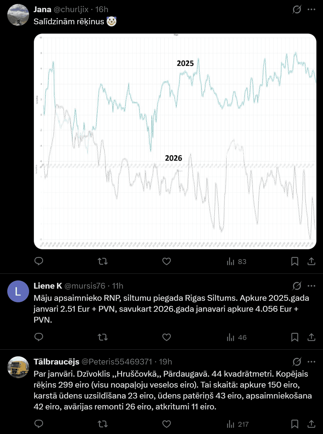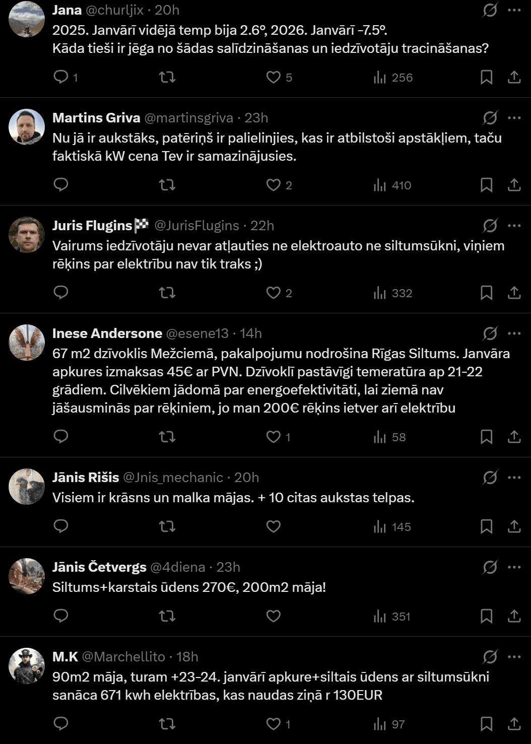 Esmu šokā par savu janvāra 754€ elektrības rēķinu – laikam mana izvēle būt atbildīgam un zaļam apsildīt māju ar siltumsūkni bija stulba izvēle (2025 gada JANVĀRIS bija 563€). – rēķinā ir visa elektrība, tai skaitā elektroauto uzlāde. Ar savu algu vismaz spēšu nomaksāt, bet lielam vairumam iedzīvotāju šīs ziemas apkures rēķini nav pa kabatai! Jūsu rēķinu piemēri mums ļoti noderēs manis vadītajā Rīgas Siltuma izmeklēšanas komisijā Saeimā.”