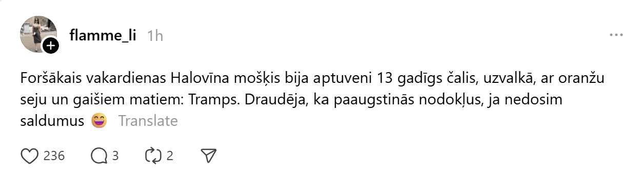 “Foršākais vakardienas Halovīna mošķis bija aptuveni 13 gadīgs čalis, uzvalkā, ar oranžu seju un gaišiem matiem: Tramps,” ierakstu vietnē “Threads” iesāk kāda soctīklu lietotāja.