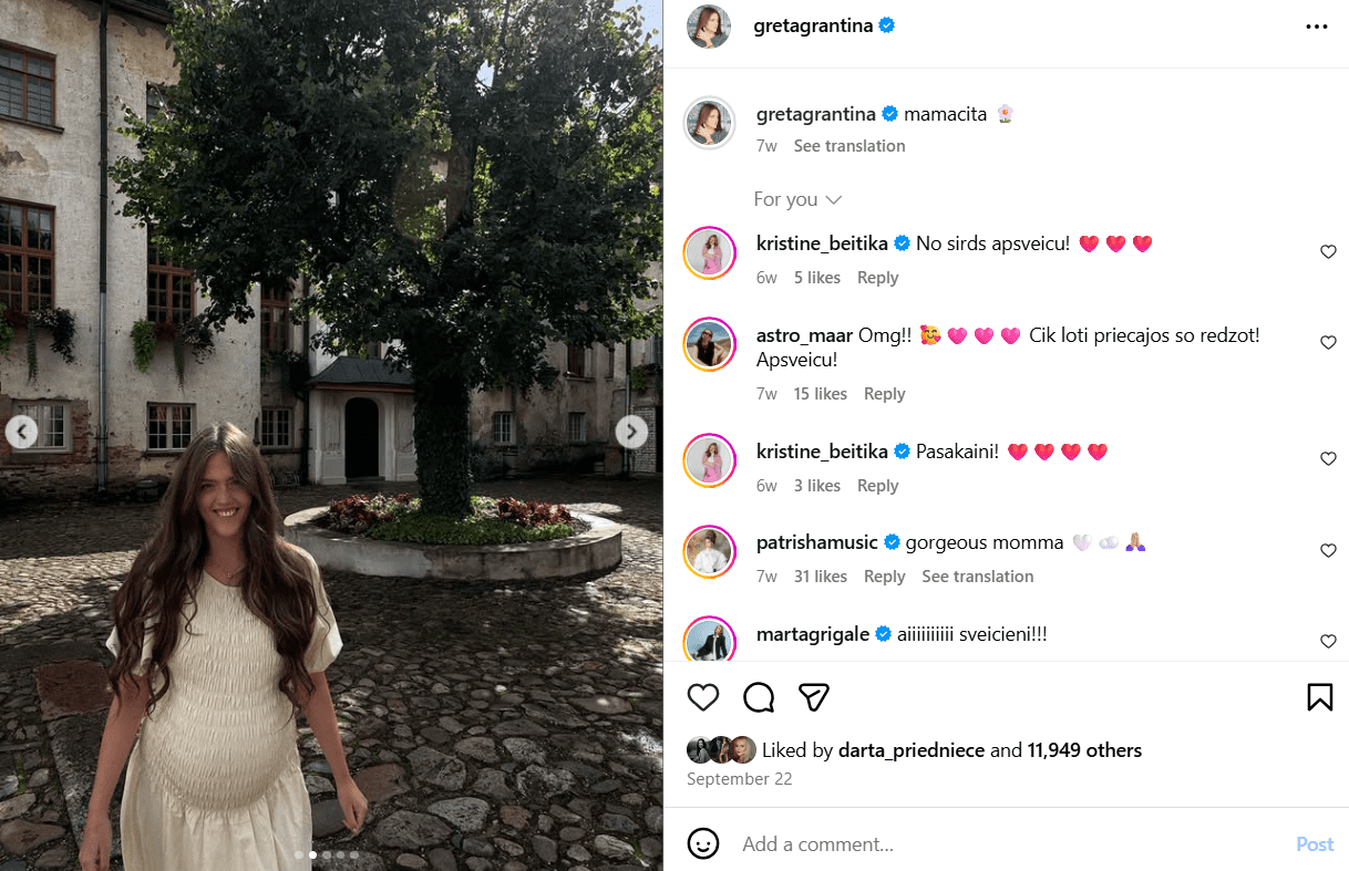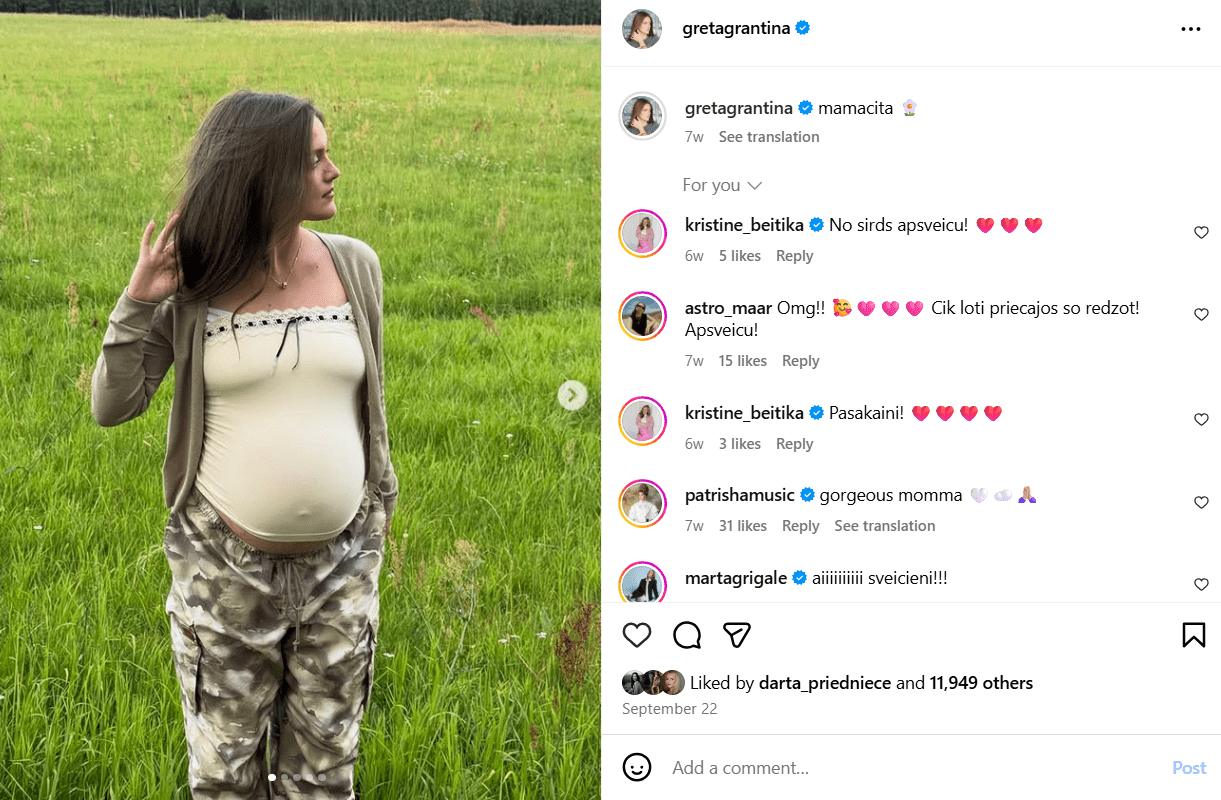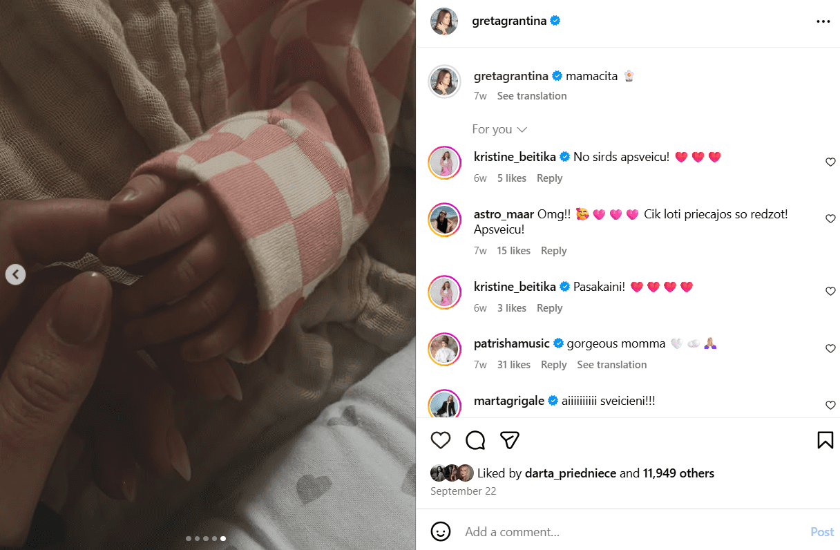 Par ģimenes pieaugumu jaunā māksliniece paziņoja otrdien, 23. septembrī, savos sociālajos tīklos. Grēta dalījās ar sirsnīgu fotogrāfiju sēriju, kurā redzama gan viņa grūtniecības laikā, gan jaundzimušās meitiņas rociņa, tādējādi apstiprinot fanu un atbalstītāju vasarā izskanējušos minējumus par gaidāmo notikumu.