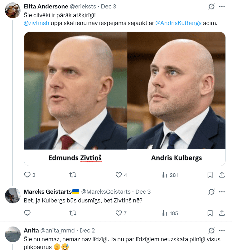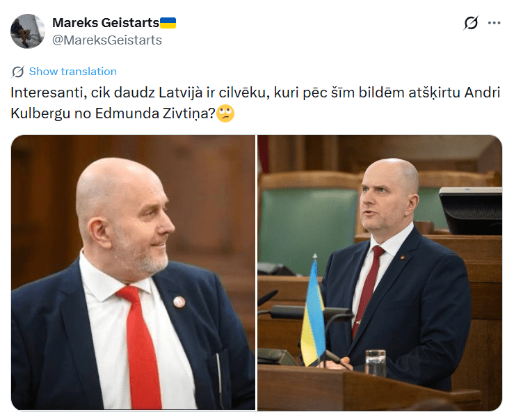 Saeimā strādā 100 deputāti, retais noteikti var nosaukt visus vārdā un uzvārdā, bet, kā latvieši saka, pēc sejas jau atpazīstam. Bet vai esi pamanījis divus deputātus, kuri ir gandrīz identiski? Kāds sociālo tīklu lietotājs pievērsis uzmanību, ka Andris Kulbergs un Edmunds Zivtiņš pirmajā acu uzmetienā ir teju neatšķirami!