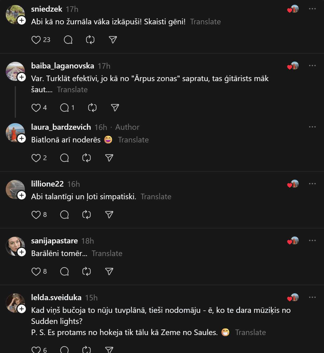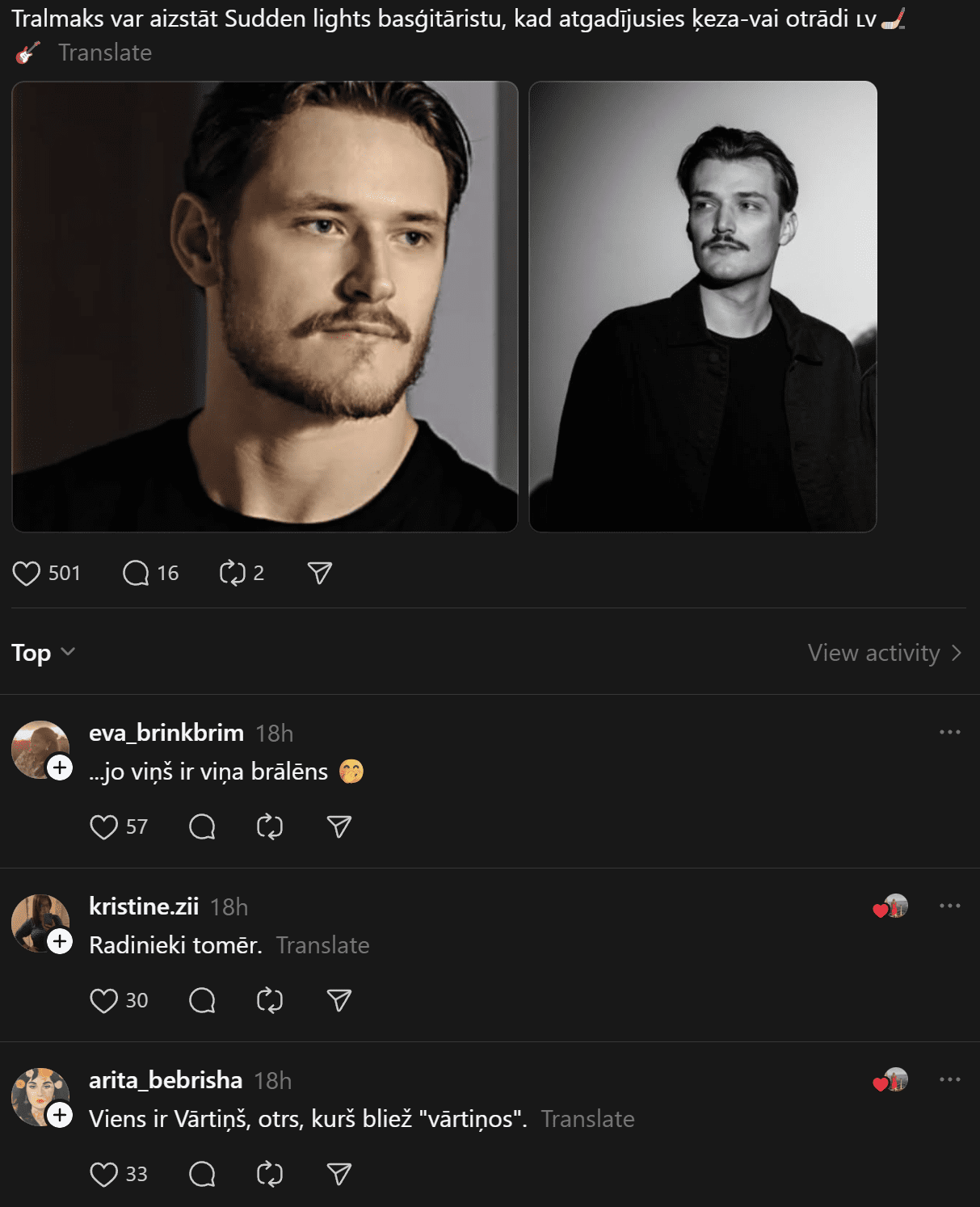 Tagad latvieši pamanījuši vēl divus līdziniekus – hokejistu Eduardu Tralmaku un “Sudden Lights” basģitārists Kārlis Vārtiņš. Komentāros ļaudis apbrīno to, cik abi vīrieši ir līdzīgi, bet daudzi arī atzīmē svarīgu faktu, kas šo līdzību izskaidro – viņi ir radinieki.