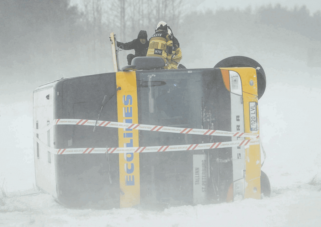 Igaunijas portālā “Delfi” publicēti fotoattēli, kuros redzams uz sāniem apgāzies autobuss ar uzrakstu “Ecolines”. Attēlos arī redzams, ka negadījuma vietā stipri snieg.