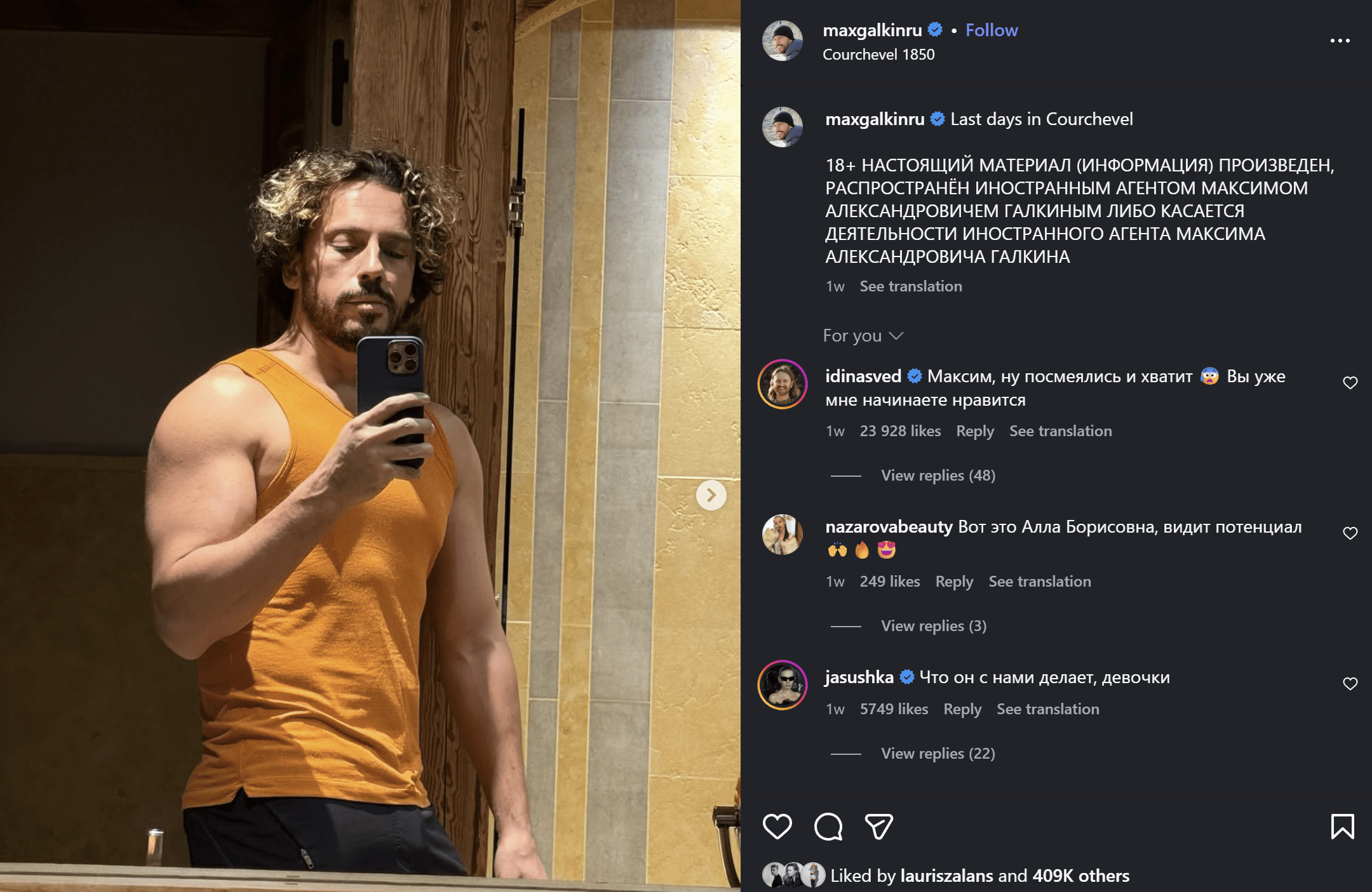 Tomēr kopš tā laika Galkins soctīklos dalījies ar personīgiem brīžiem no privātās dzīves, ļaujot ieskatīties savā ikdienā – viņš pavada laiku ar sievu Allu Pugačovu un bērniem. Devies gan slēpot, gan baudīt citus ziemas prieku, bet tam visam pa vidu – krasi mainījis savu vizuālo tēlu, parādot, kā uzaudzējis muskuļus.