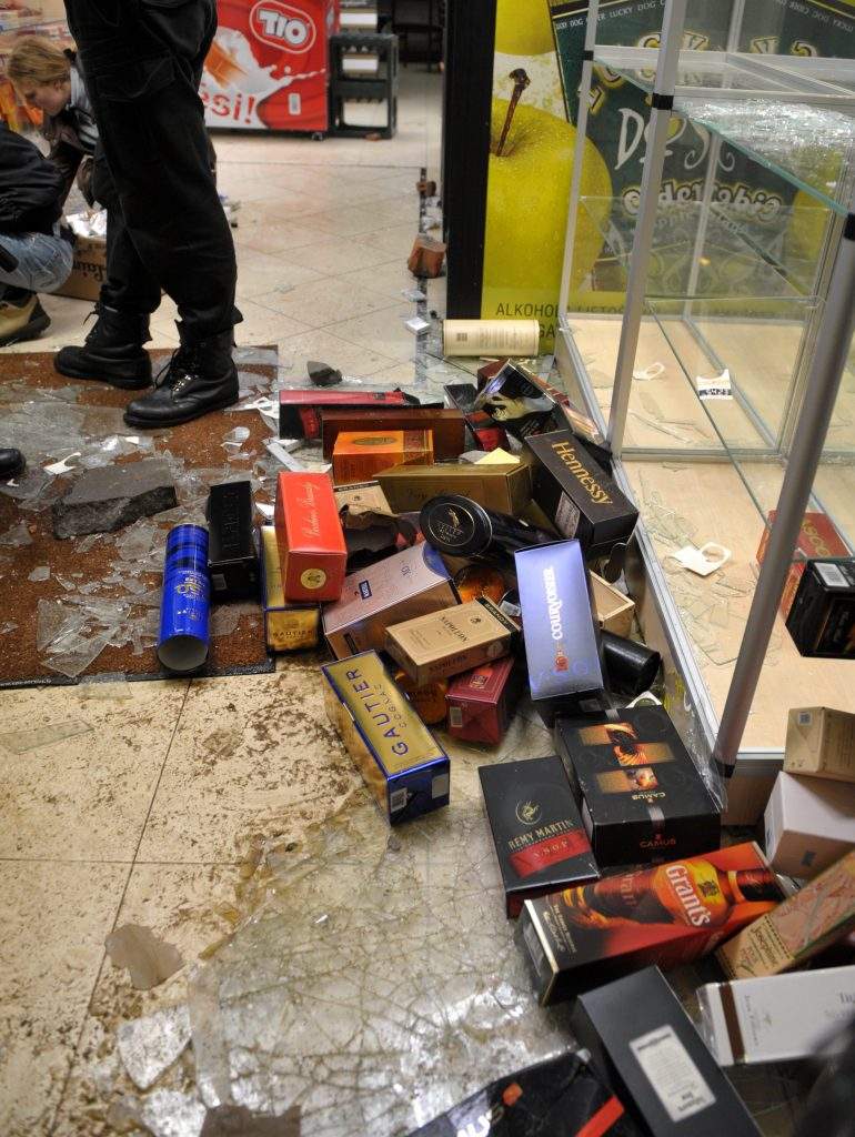 * veikalam “Latvijas Balzams” (izsisti durvju un vitrīnu stikli, sadauzīti dzērienu skapji, izlaupīta veikalā esošā prece) – 2442 lati (3475 eiro);