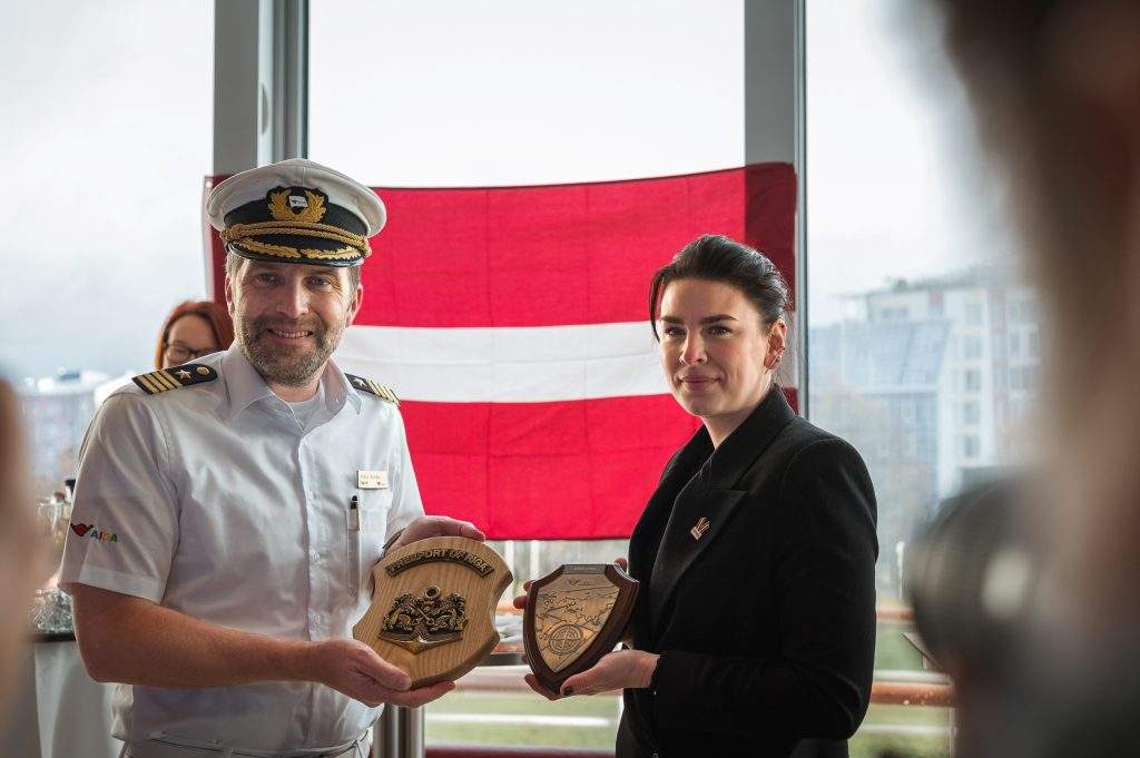 Kuģis Rīgu apmeklē pirmoreiz, tāpēc, ievērojot tradīciju, lai sveiktu tā apkalpi ar pirmo vizīti Rīgā, 18. novembrī uz tā klāja notika ostas un kuģa ģērboņu apmaiņas ceremonija. Ievērojot zīmīgo datumu, kuģa kapteinim un tā komandai Rīgas ostas pārstāvji bija sarūpējuši arī īpašu sveicienu – jubilejas torti Latvijas karoga krāsās.