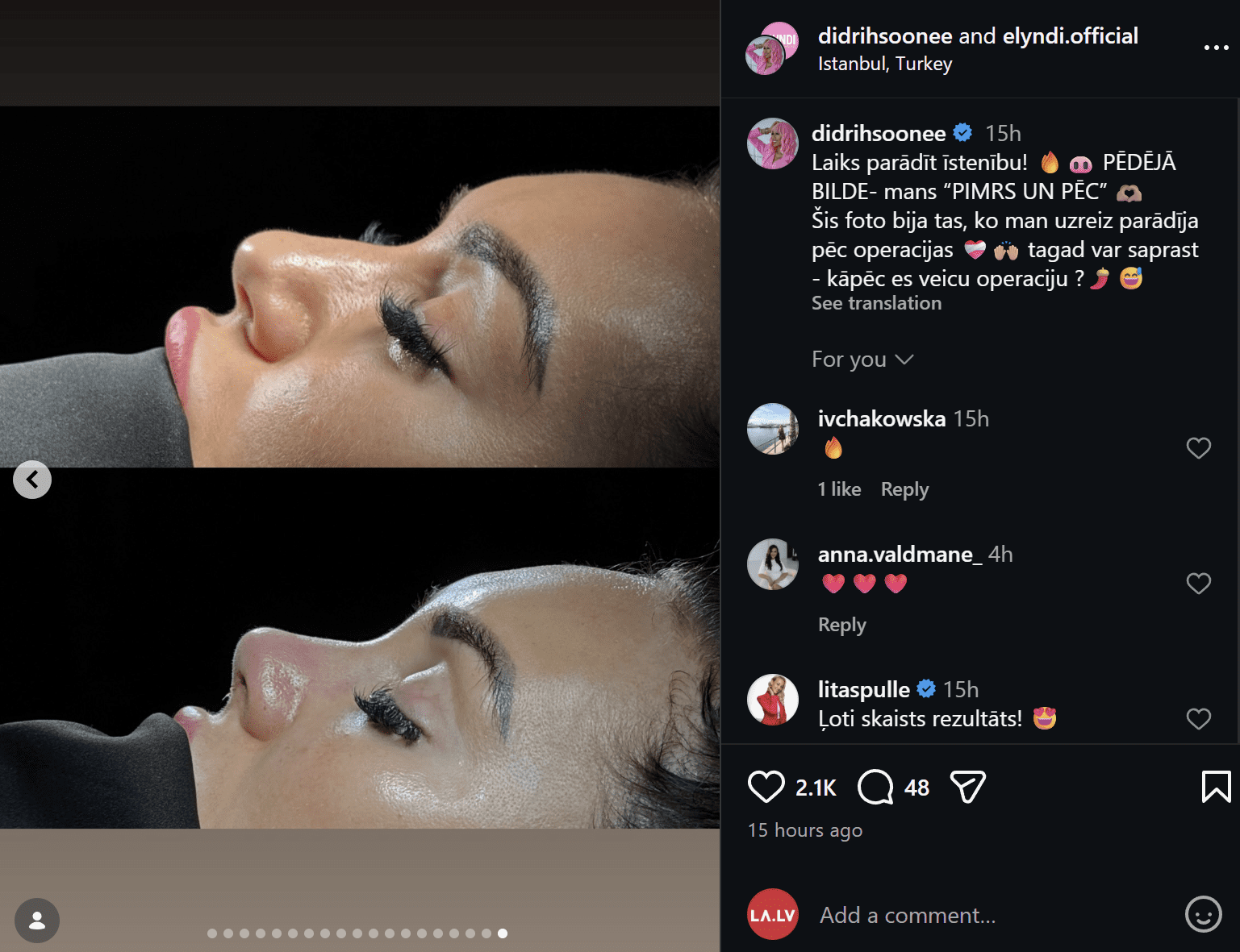Sociālajos tīklos viņa atklāj, cik izmaksājusi šī operācija – 3700 eiro. Šajā summā bija iekļauta operācija,viena diena slimnīcā un piecas dienas pašā Turcijā. Tagad viņa skaidri parāda, kā viņas deguns izskatījies pirms un pēc operācijas.