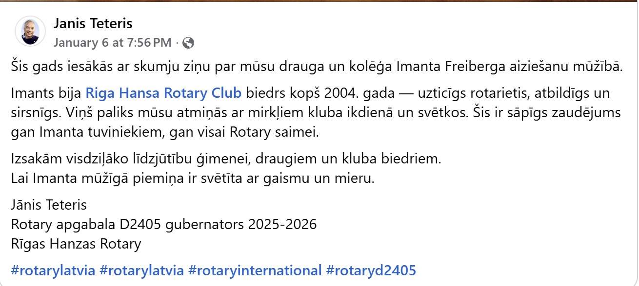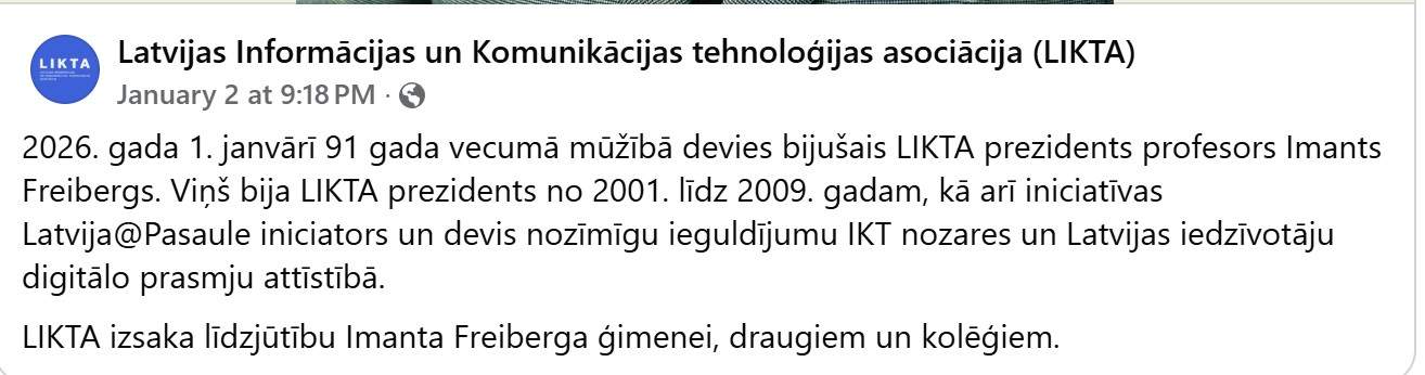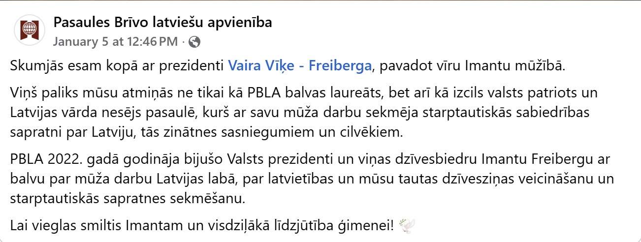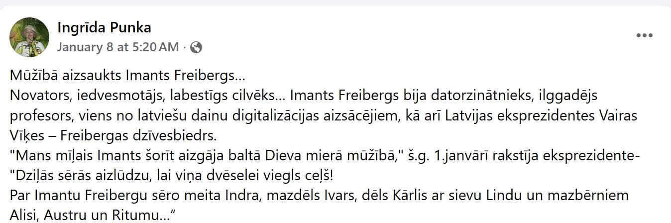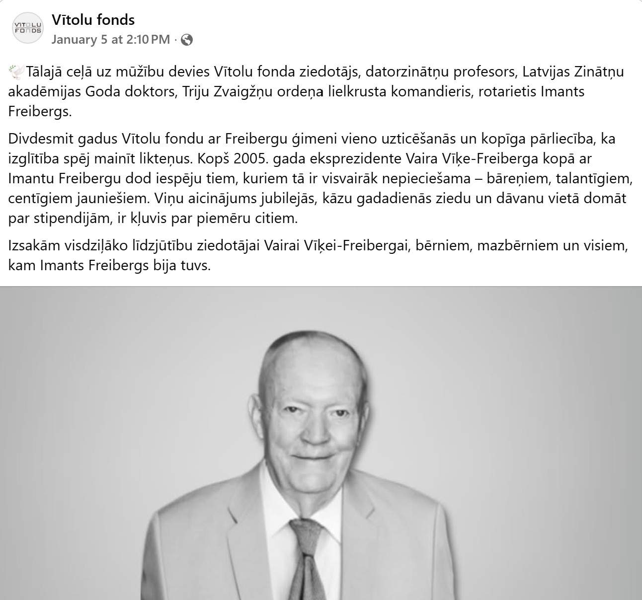 Rīgas Domā šodien plkst. 14 notika Jaunā gada pirmajā dienā mirušā bijušās Valsts prezidentes Vairas Vīķes-Freibergas vīra, datorzinātņu profesora Imanta Freiberga izvadīšana, liecina eksprezidentes izplatītais aizgājēja tuvinieku paziņojums tviterī.