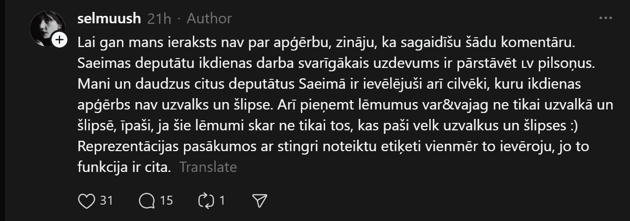 Pēdējās dienās soctīklos tika novērots sašutums par Saeimas deputāti Selmu Levrenci. Nē, nevis par viņas sacīto tribīnē, bet par to, kā viņa bija ģērbusies.