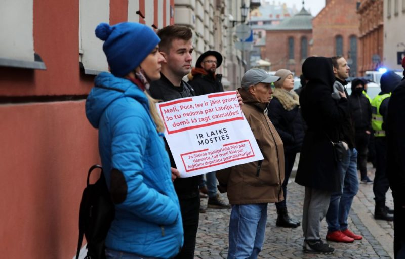 Kā novēroja aģentūra LETA, piketā pie parlamenta ēkas bija pulcējušies aptuveni 50 cilvēku, daļai no viņiem nebija sejas aizsargmasku. Piketa organizētājs, deputāts Aldis Gobzems, kurš uz piketu aicināja visus, kuri “negrib meli un caurlaižu zagli” par deputātu, pats filmēja protesta akciju.