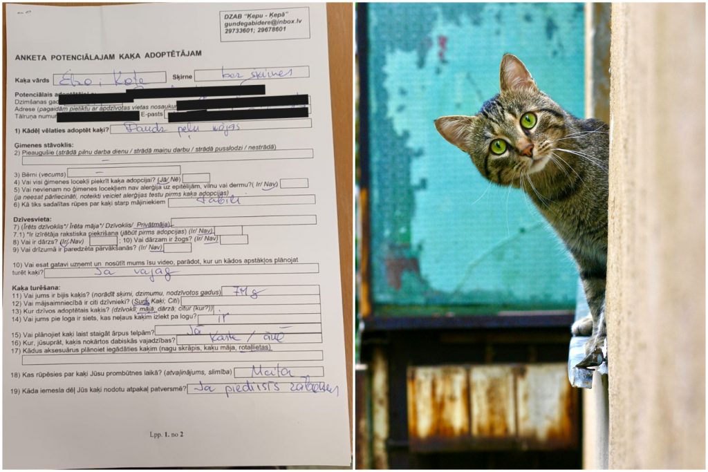 Ierakstam ir pievienoti attēli, kurā redzama aizpildītā anketa, un atbildes, ko sniedzis cilvēks, kurš vēlējies adoptēt bezšķirnes kaķi.