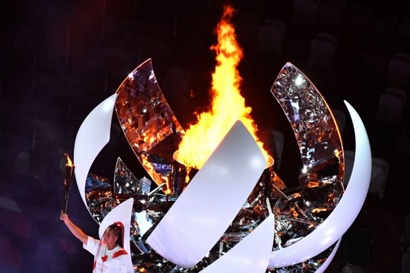 Olimpisko uguni Tokijas stadionā iededza viena no pasaules labākajām tenisistēm 24 gadus vecā Naomi Osaka, kuras spēle olimpiskā tenisa turnīrā tādēļ no sestdienas tika pārcelta dienu vēlāk. Olimpiskā lāpa ir veidota stilizēta japāņu svētā kalna Fudzi veidā.