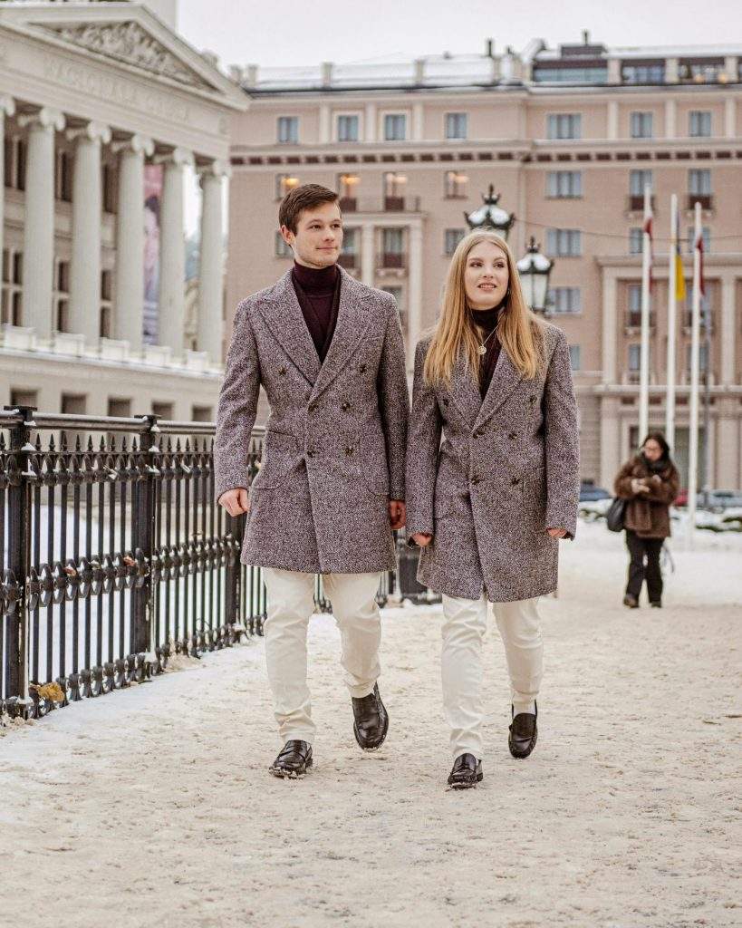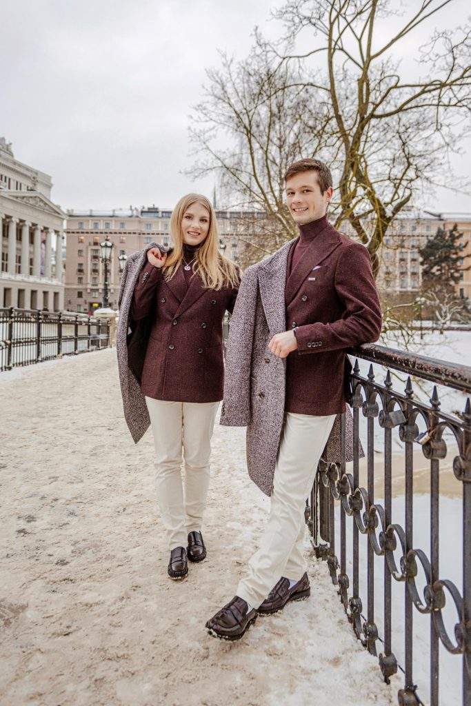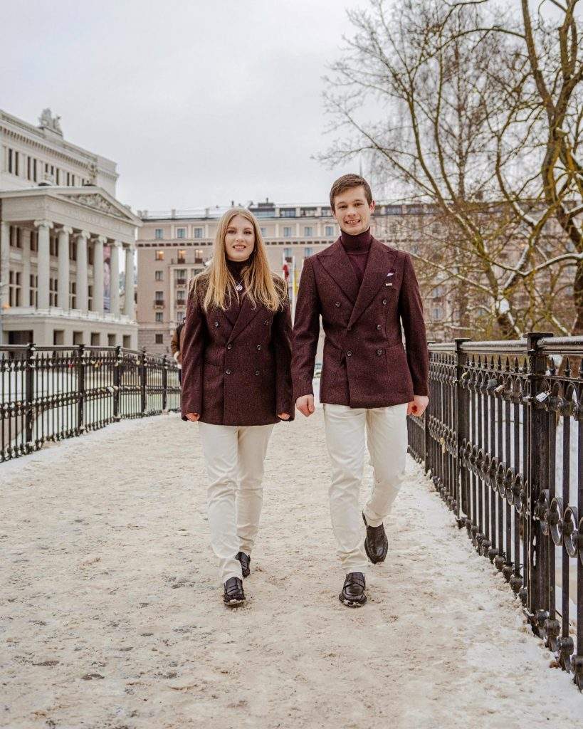 Kolekcijā ietilpst bordo krāsas džemperis ar augstu apkakli un pieskaņota toņa divrindu pogu aizdares žakete, pelēcīgs divrindu pogu mētelis un gaišas bikses, veidojot vizuāli sabalansētu un elegantu kombināciju. Žaketes un mēteļa sastāvā izmantotā vilna nodrošina gan siltumu, gan dabisku kritumu, ļaujot tērpam saglabāt eleganci un komfortu, vienlaikus atspoguļojot pārliecību un gatavību pārstāvēt Latviju pasaules lielākajā sporta notikumā.
