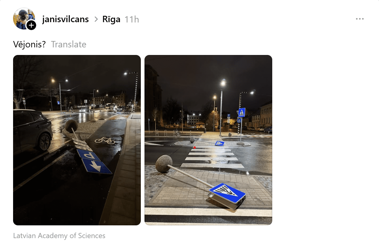 FOTO. VIDEO. Apgāztas Ziemassvētku egles, bojātas ceļazīmes, traucēta elektroapgāde un pat gaisa satiksme – Latvijā turpina plosīties stiprs vējš 8