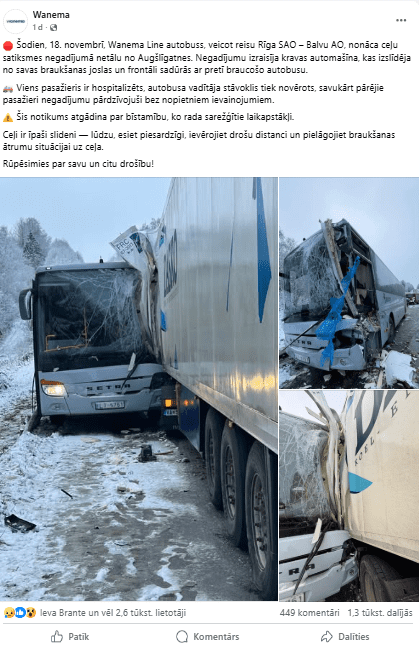 “18. novembrī “Wanema Line” autobuss, veicot reisu Rīga SAO – Balvu AO, nonāca ceļu satiksmes negadījumā netālu no Augšlīgatnes. Negadījumu izraisīja kravas automašīna, kas izslīdēja no savas braukšanas joslas un frontāli sadūrās ar pretī braucošo autobusu,” “Facebook” raksta uzņēmuma pārstāvji.