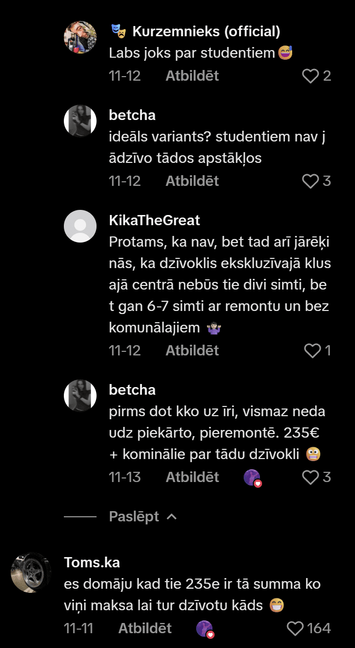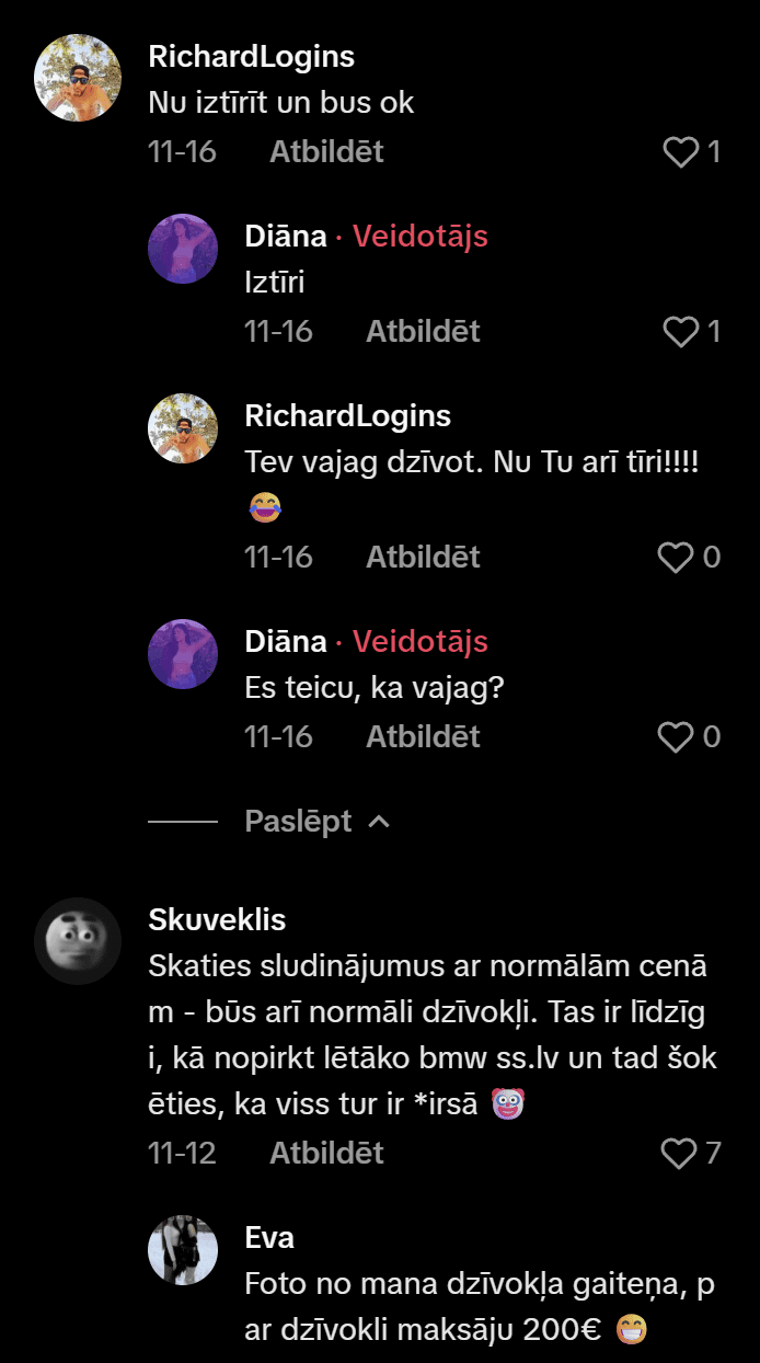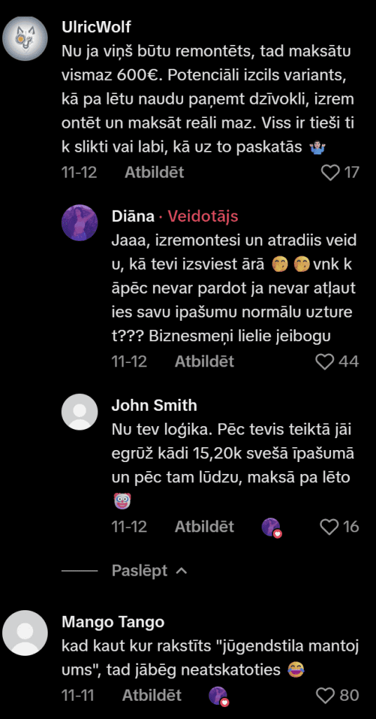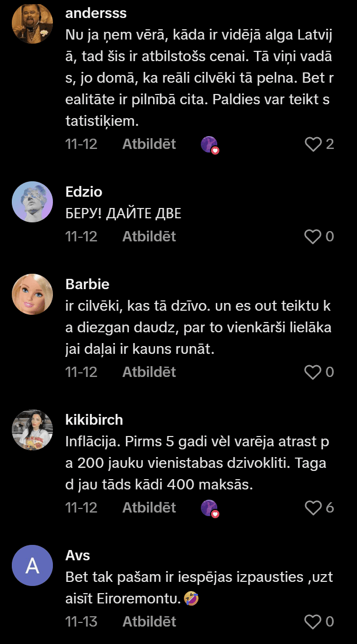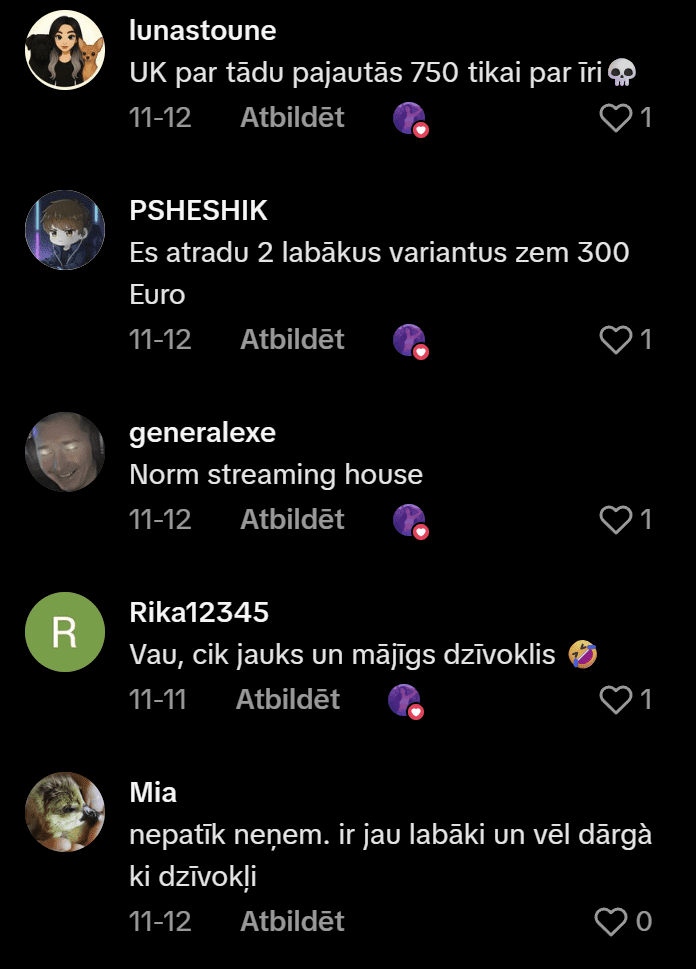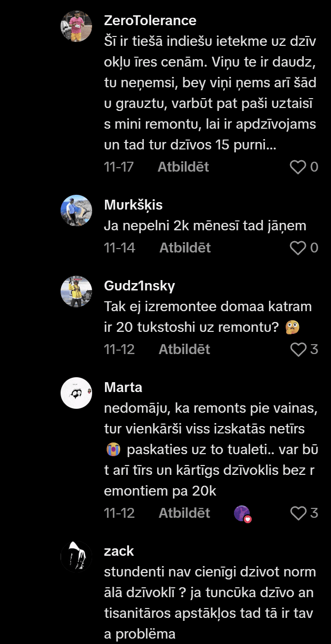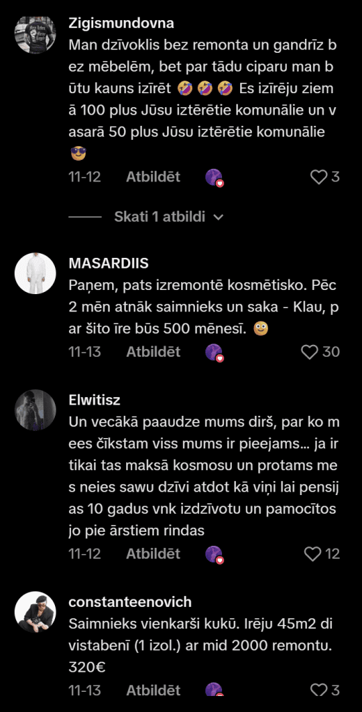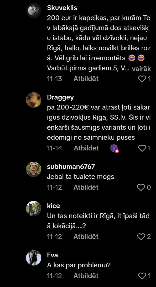 “235 eiro mēnesī par trīsistabu dzīvokli, izolētas ir tikai divas istabas. Komunālie maksājumi nav iekļauti šajā summā. Paskatoties foto, vienkārši ārprāts! Man nav vārdu! Uz kurieni pasaule iet? Saprotiet, ka ir cilvēki, kuriem nav variantu, un vienkārši jāņem šādi dzīvokļi?” “Tik tok” jautā kāda jauna sieviete.