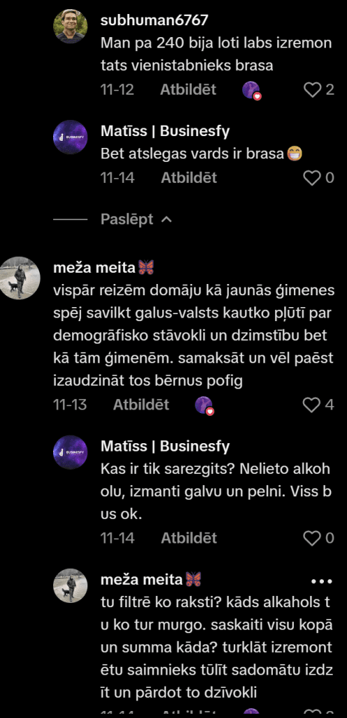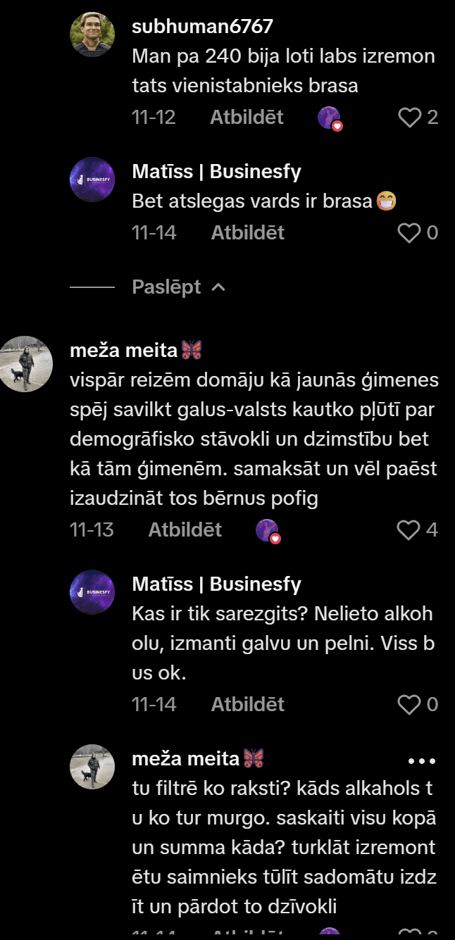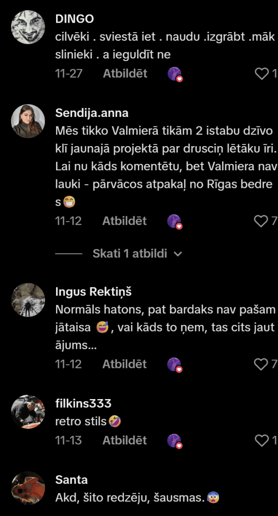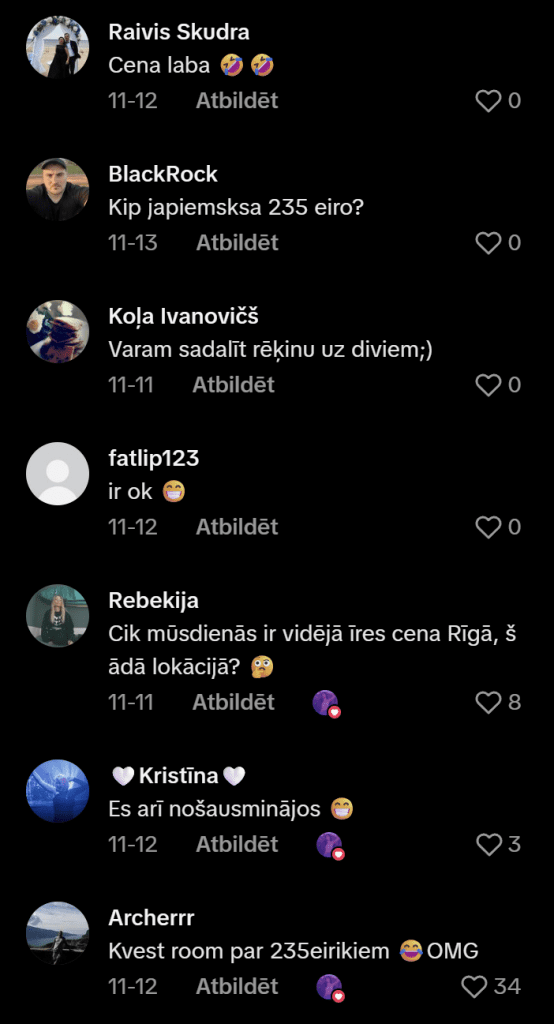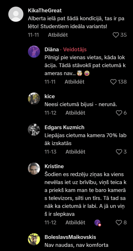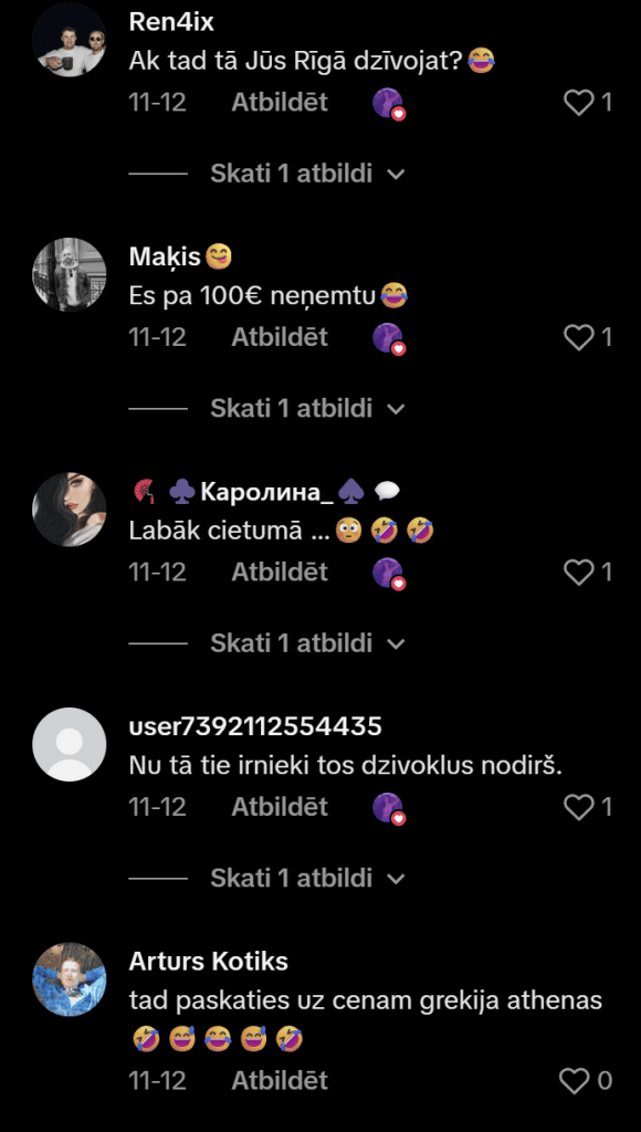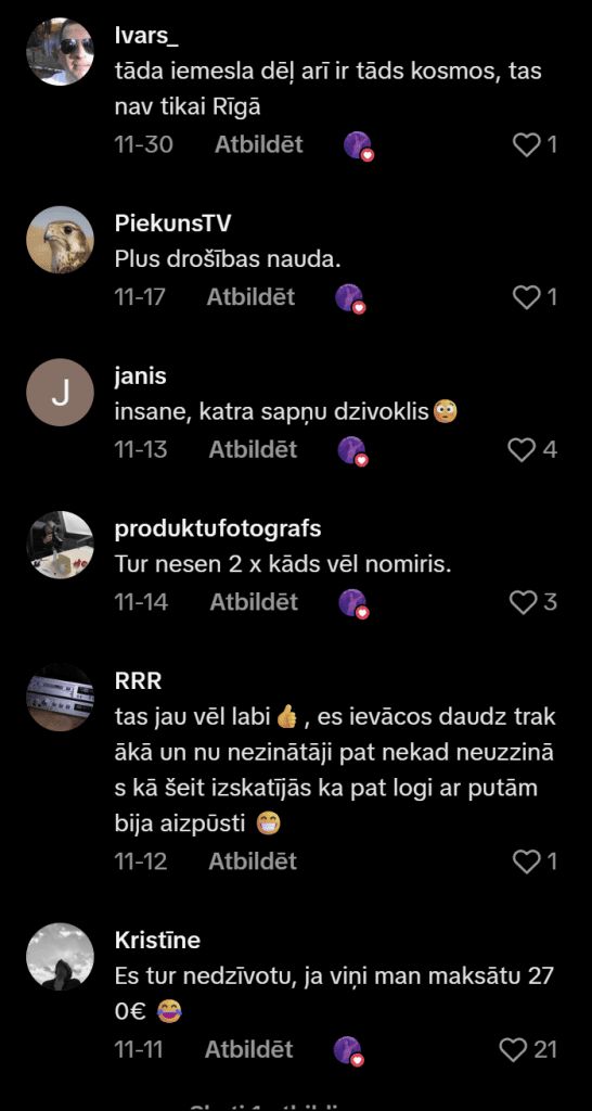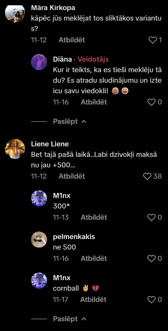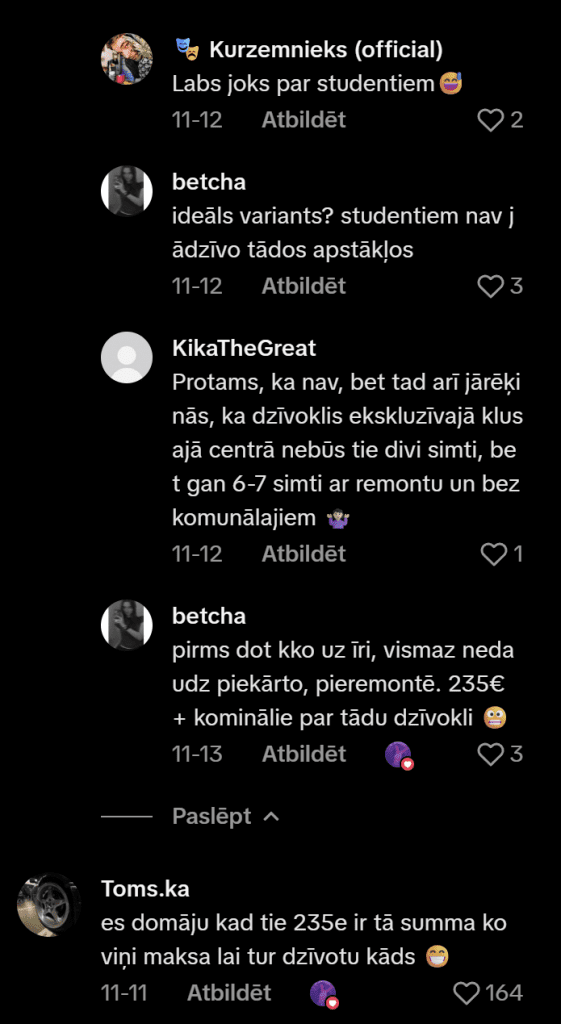 “235 eiro mēnesī par trīsistabu dzīvokli, izolētas ir tikai divas istabas. Komunālie maksājumi nav iekļauti šajā summā. Paskatoties foto, vienkārši ārprāts! Man nav vārdu! Uz kurieni pasaule iet? Saprotiet, ka ir cilvēki, kuriem nav variantu, un vienkārši jāņem šādi dzīvokļi?” “Tik tok” jautā kāda jauna sieviete.