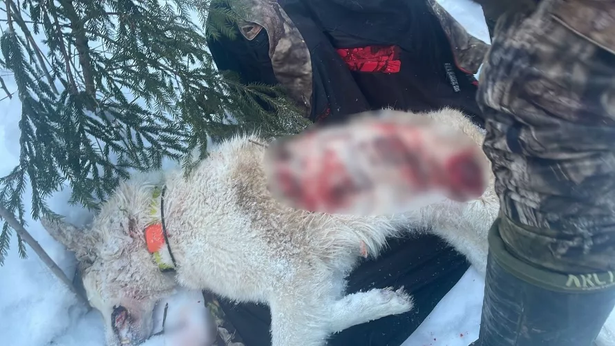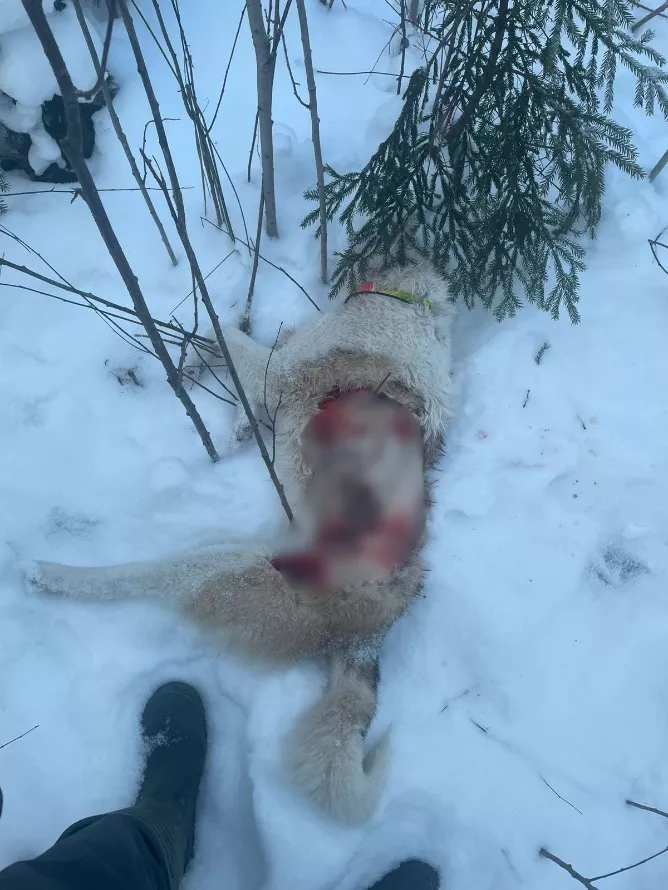 FOTO, VIDEO. Trauma visai ģimenei, asinis stindzinoši skati! Vidzemes pusē medību laukā dzīvs saplosīts medību suns 0