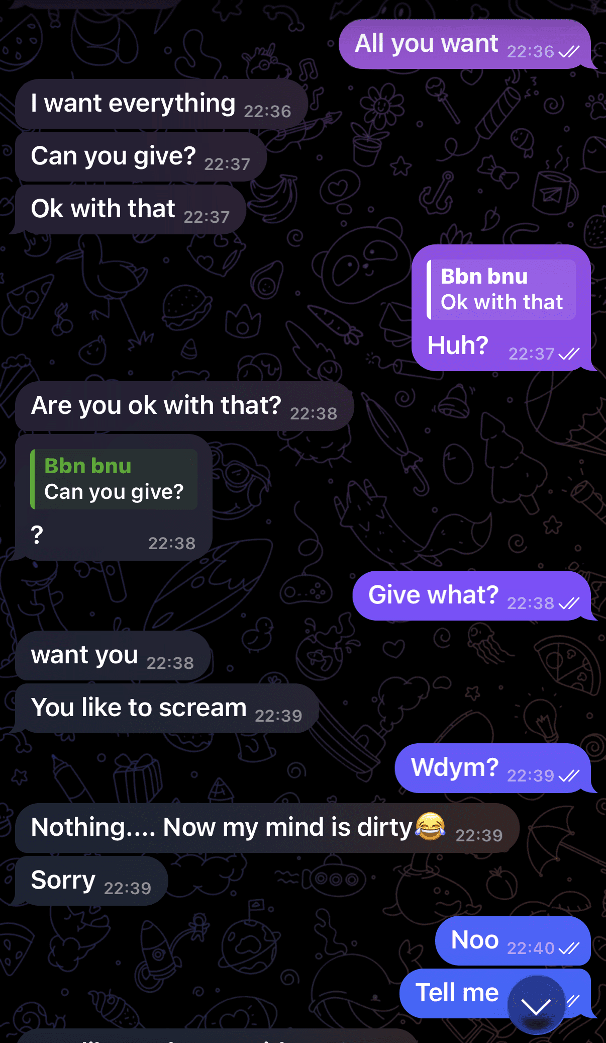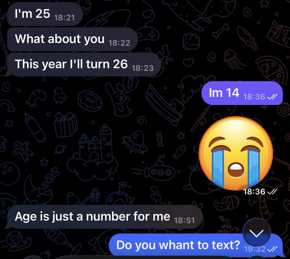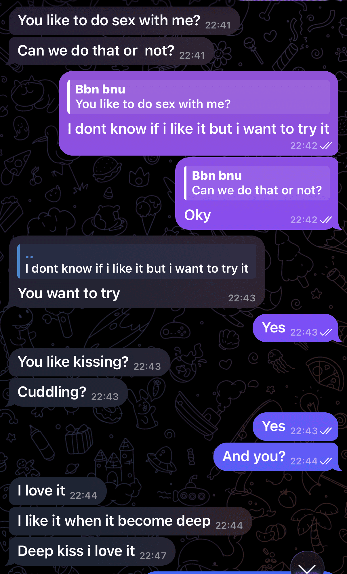 Lūk, arī ekrānuzņēmumi no viņu sarakstes! Īsumā latviski atstāstot saturu, sarakstē indiešu students paudis vēlmi pēc seksuālām attiecībām ar savu “nepilngadīgo” sarunu biedreni, jautājis, vai viņai patīk skūpstīties, rosinājis kļūt par viņa meiteni. Šī gan ir vien daļa no kopējās satakstes.