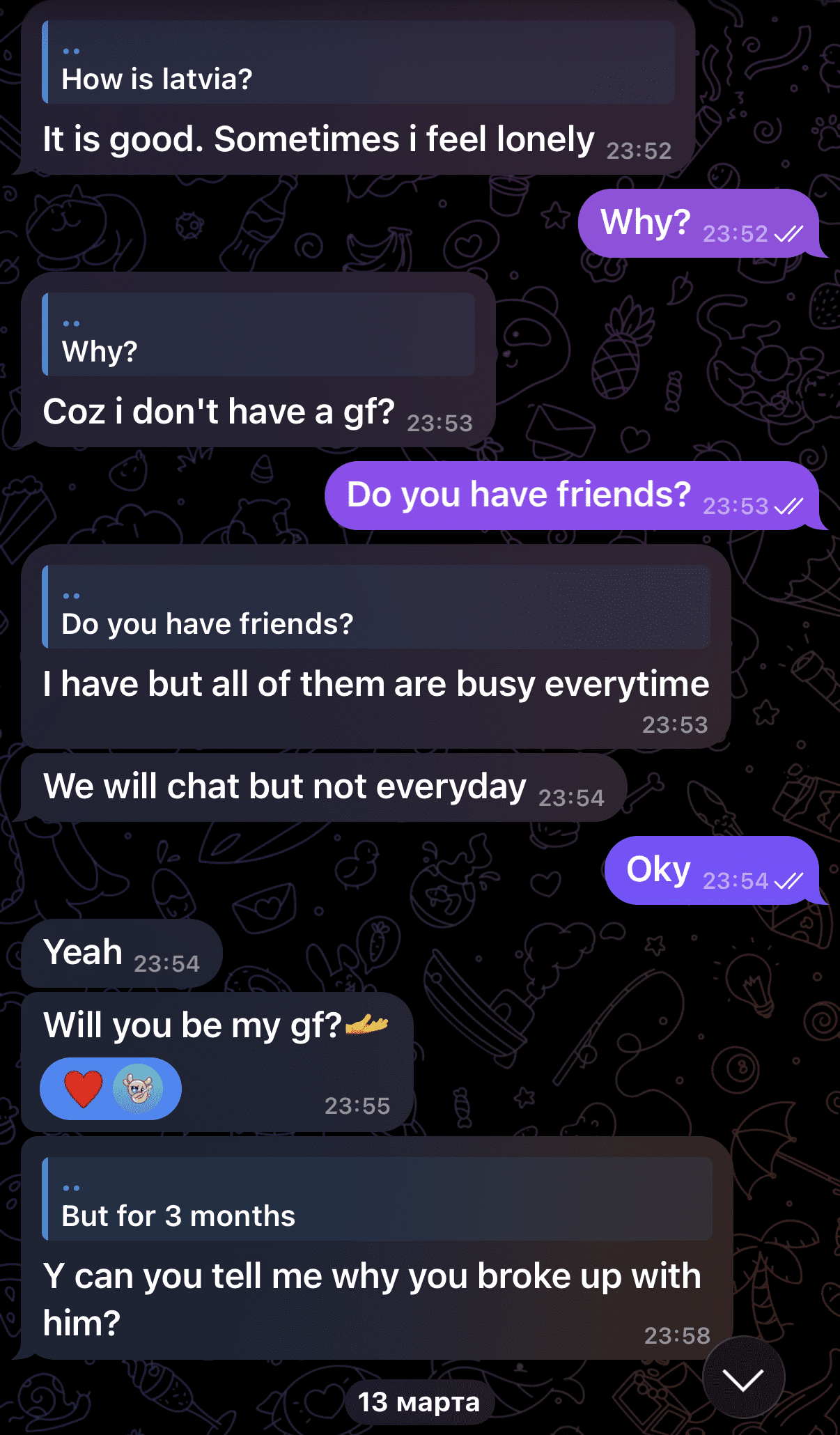 Kad indietis gribēja tikties, piesaistītā meitene arī bija tam gatava, taču viņai bija spēcīga aizmugure – 7 cilvēki, kuri sekoja visam līdzi, lai nepieciešamības gadījumā steigtos meitenei palīgā. Indietis dzīvo uz Blaumaņa ielas.