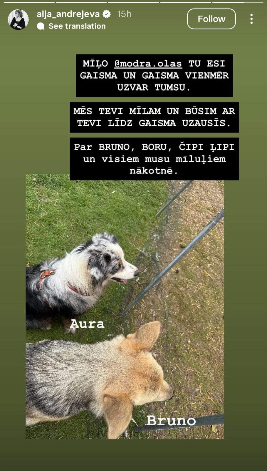 Arī dziedātāja Aija Andrejeva sociālo mediju platformā “Instagram” kavējās atmiņās atceroties savu satikšanos ar nogalinātajiem sunīšiem šī gada vasarā. Dziedātāja publicēja video no vasaras, kurā redzams, ka ciemojas zemnieku saimniecībā “Modra olas”. Video redzami arī nogalinātie suņi, kuri kā Aija raksta bija ļoti draudzīgi. “Mīļo @Modra.olas tu esi gaisma un gaisma vienmēr uzvar tumsu. Mēs tevi mīlam un būsim ar tevi līdz gaisma uzausīs. Par Bruno, Boru, Čipi, Ļipi un visiem mūsu mīļajiem nākotnē,” raksta dziedātāja savā publikācijā.
